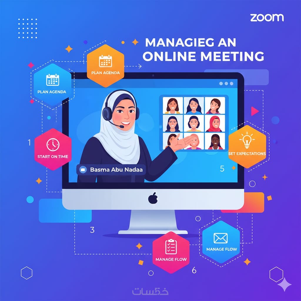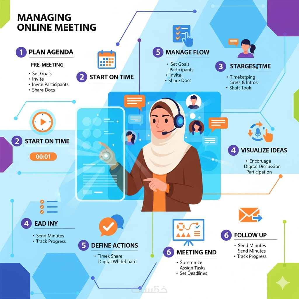 * إدارة الدخول: قبول الحضور، التأكد من جودة الصوت، وتوجيه المشاركين.