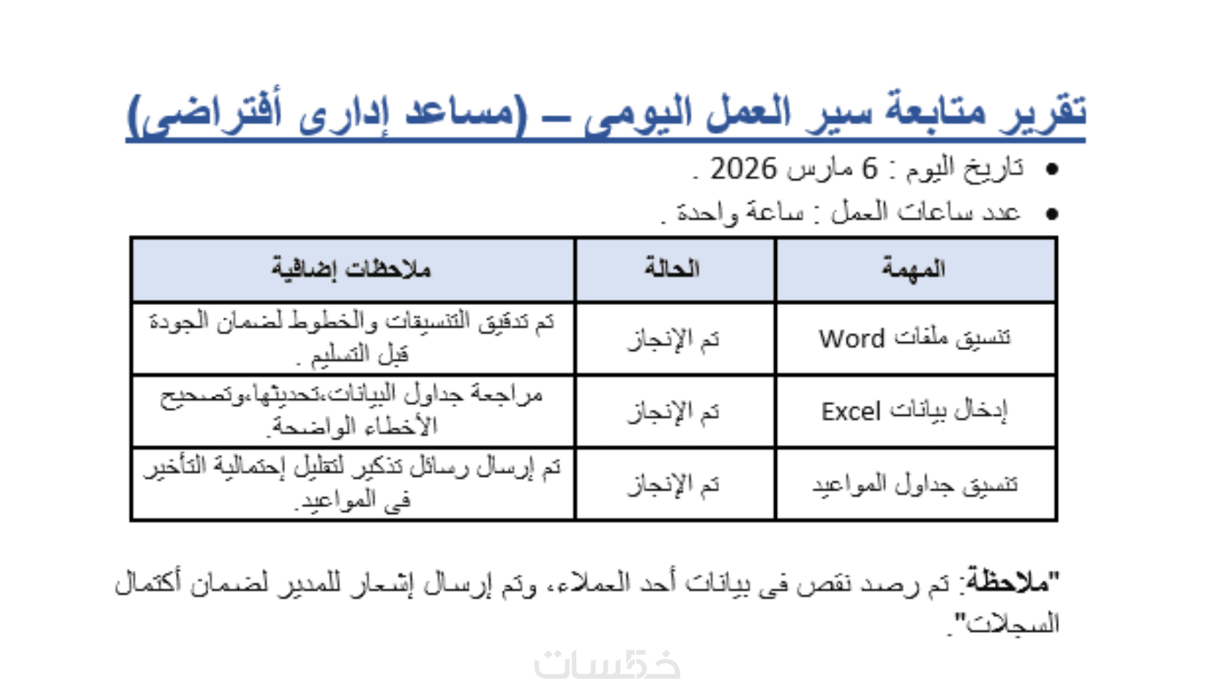 تقارير الإنجاز: تقديم تقرير يومي يوضح كافة المهام المنفذة.