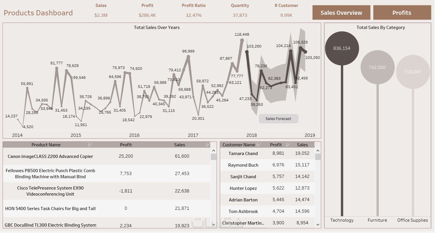 جداول توضح تفاصيل المنتجات والعملاء (مبيعات وأرباح)