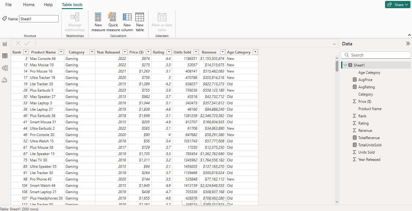 ملف Excel يحتوي على بيانات المنتجات، السعر، عدد الوحدات المباعة، التقييم، وسنة الإصدار