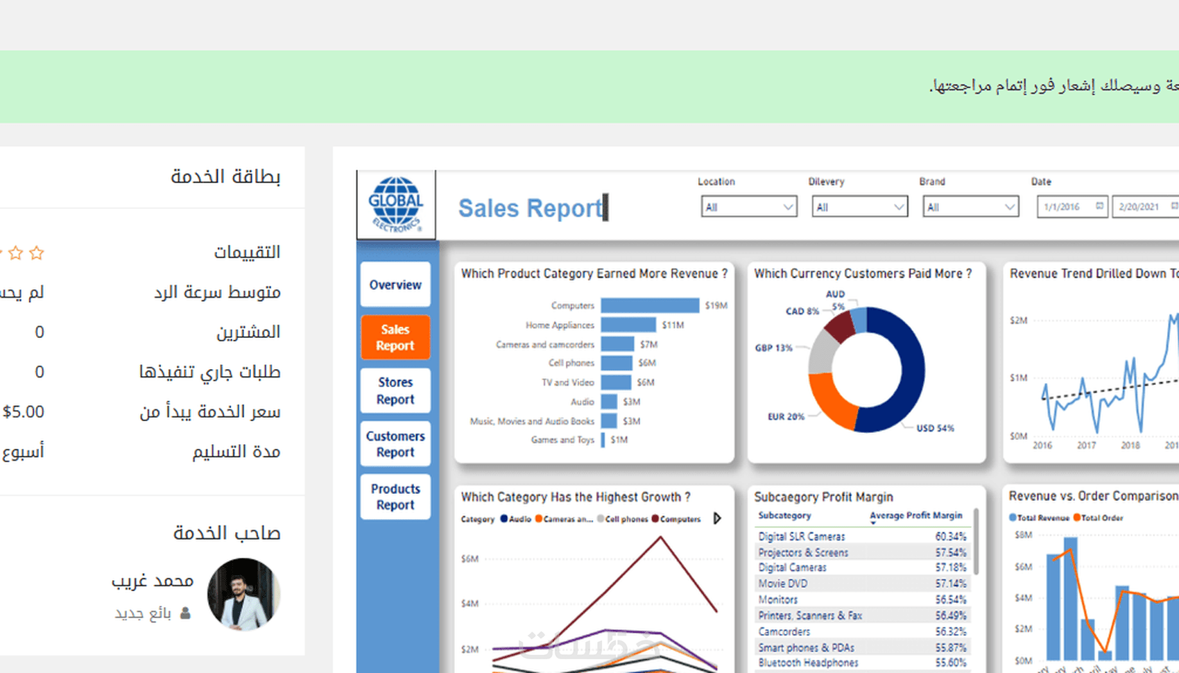 1- تحليل بيانات مكونه من شيت او اكثر يحتوي علي 5000 صف 2- عمل داشبورد في ضفحه او اكثر بشكل تفاعلي وجذاب ومرتبطه ببعضها 3- استخدام اكثر من شكل بياني لتوضيح التحليل بشكل دقيق 5- عمل power point يشرح التحليل ويساعد ع فهم التفاصيل