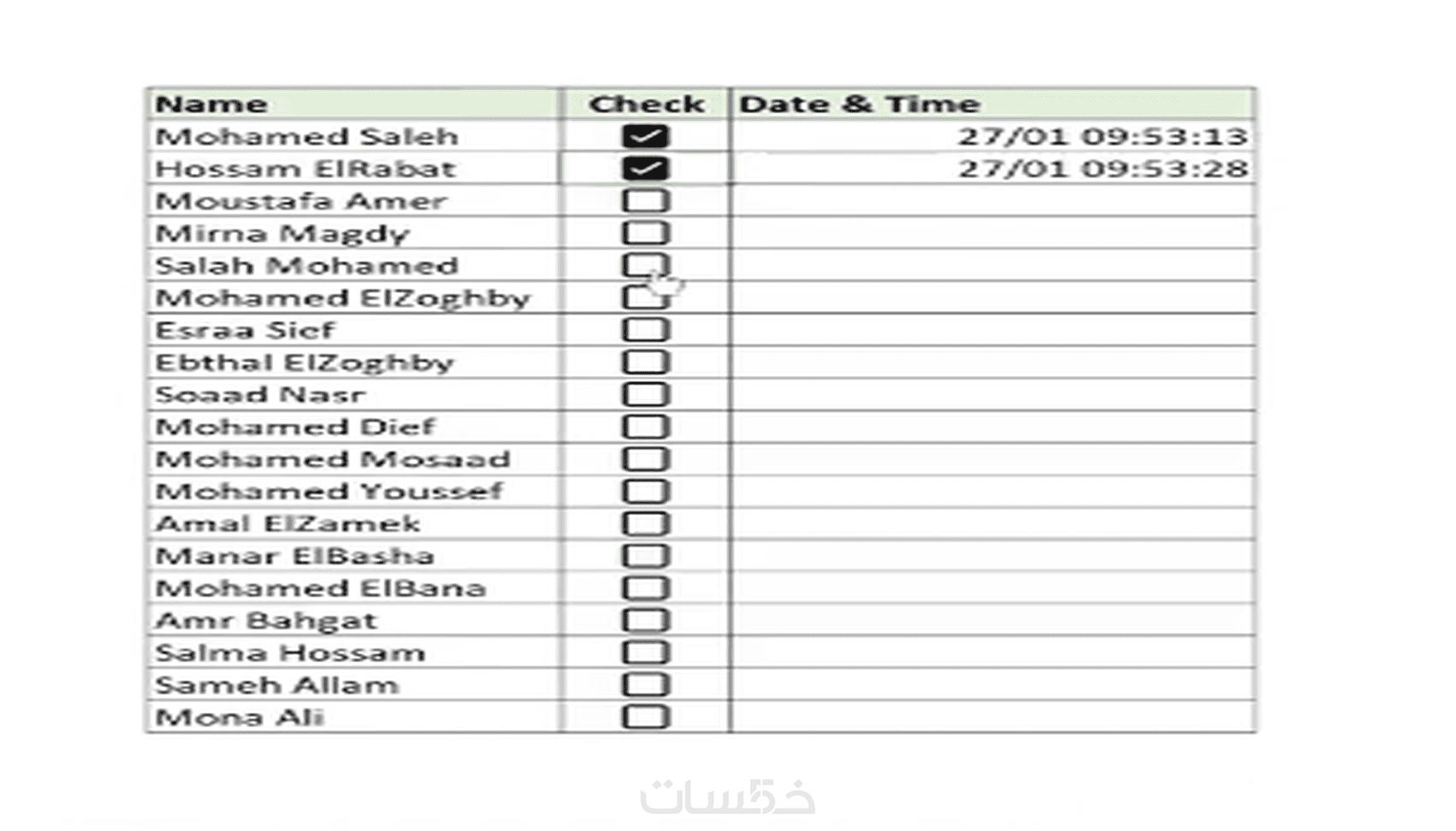 تصميم جدول تسجيل حضور بسيط يشمل 100 صف و5 أعمدة كحد أقصى.