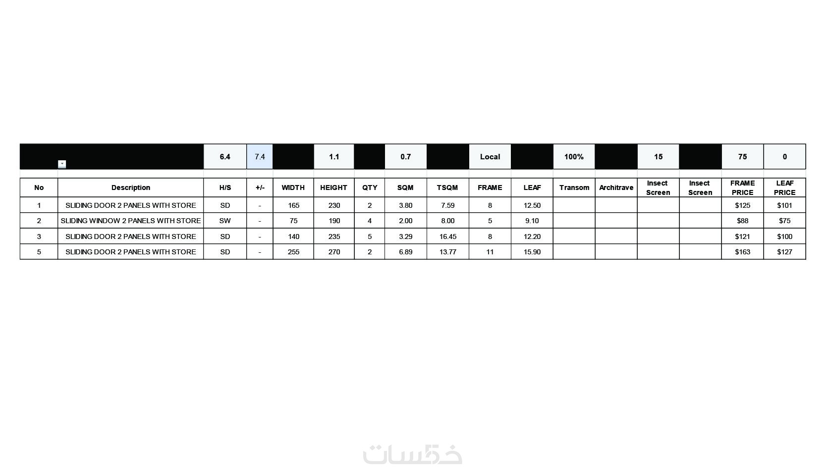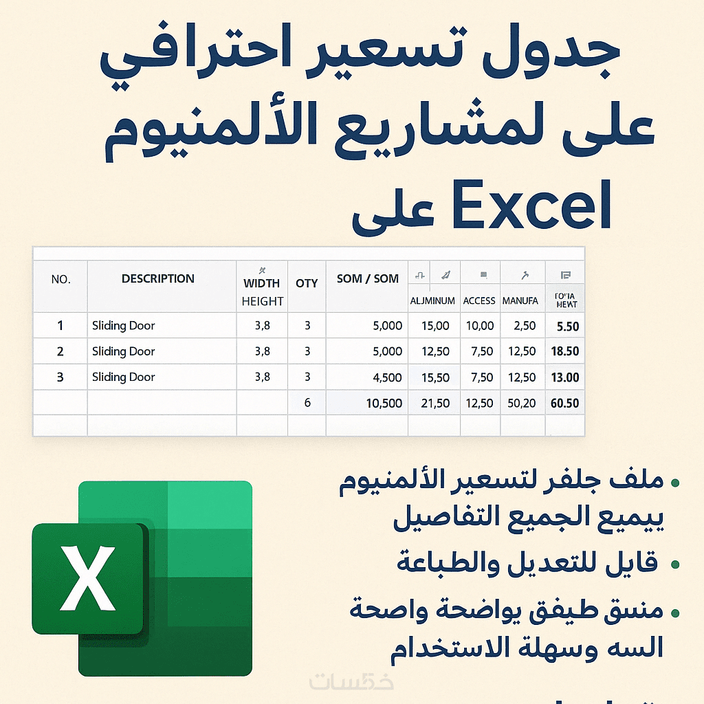 أقدّم لك خدمة إعداد ملف تسعير منظم لمشاريع الألمنيوم على برنامج Excel يشمل: