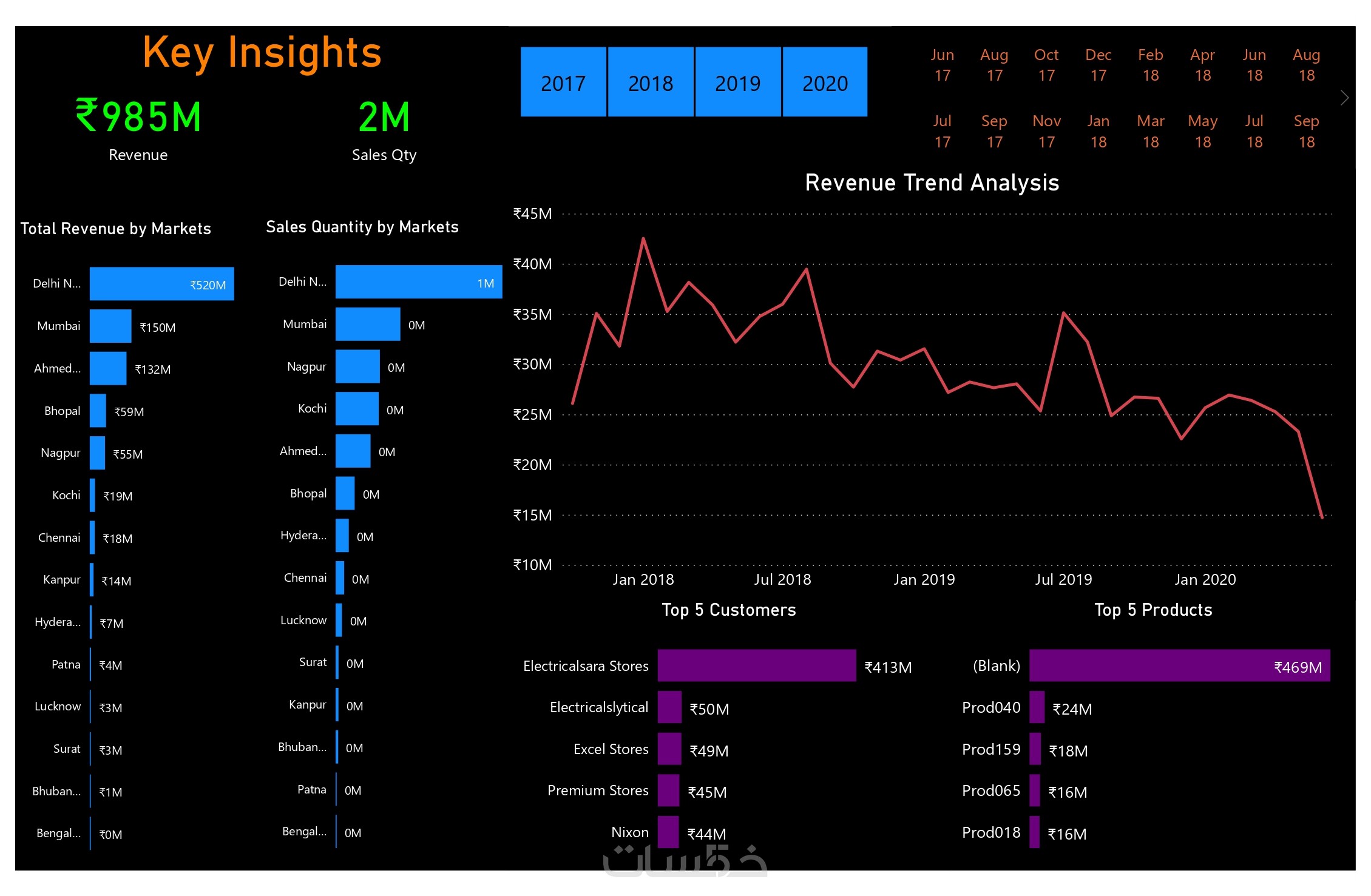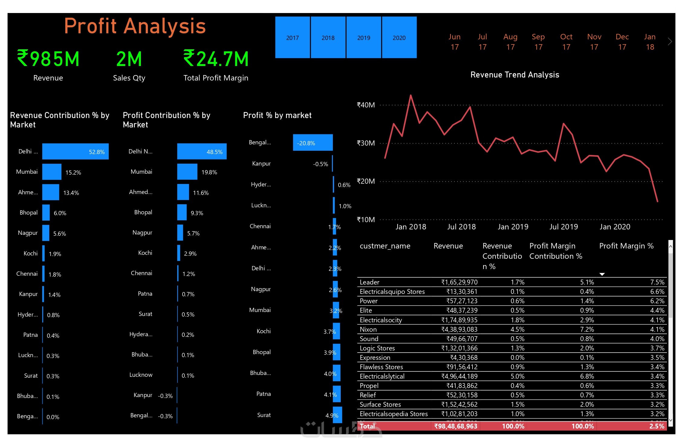 لوحات معلومات Power BI مصممة باحتراف، تُظهر مؤشرات الأداء مثل إجمالي المبيعات، الأرباح، والمناطق الأعلى ربحًا.