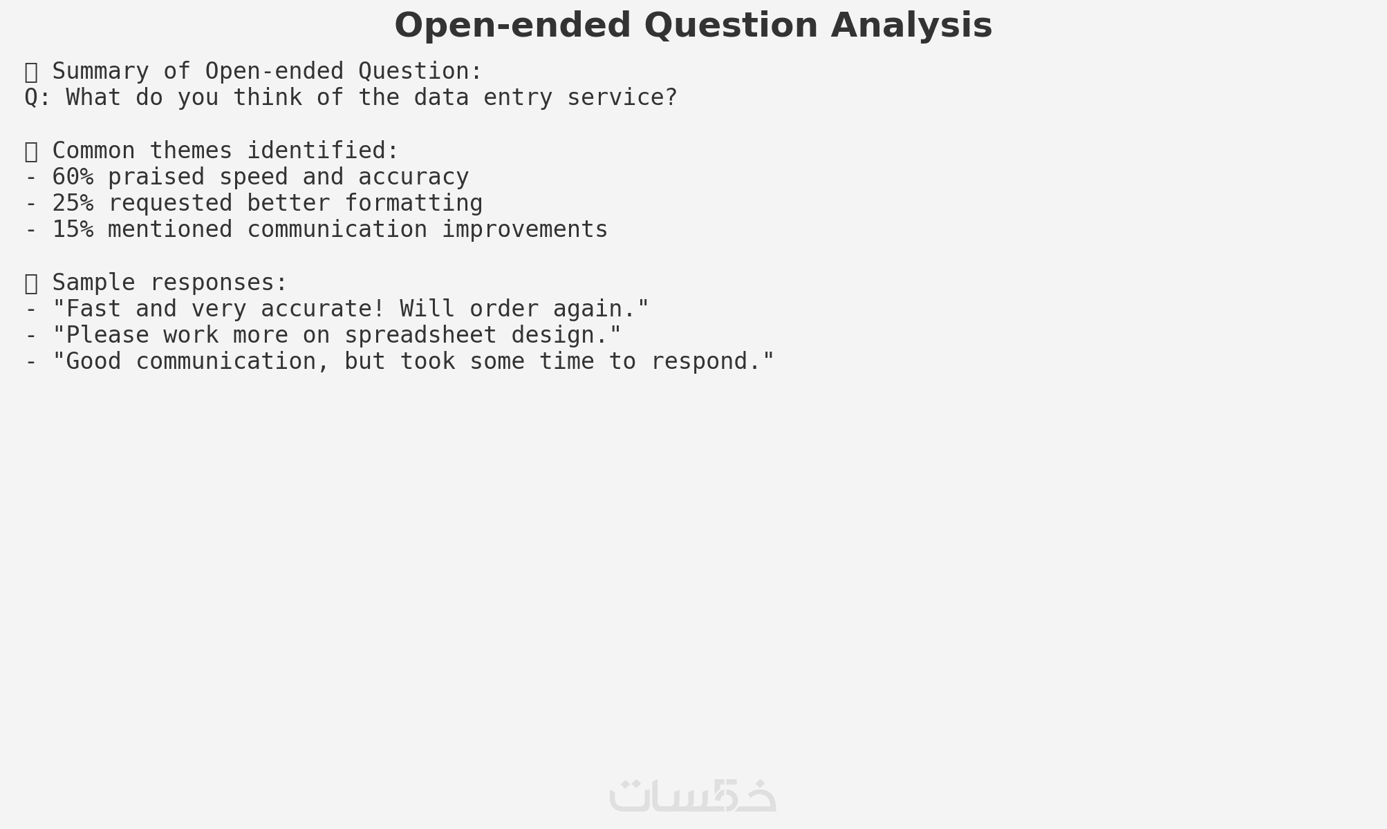ستستلم تقريرًا مبسطًا لتحليل بياناتك (ملف Excel أو Google Sheets أو استبيان Google Form) يتضمن: