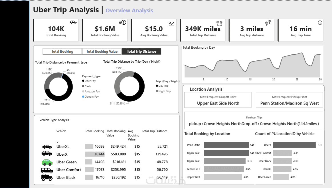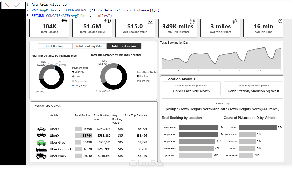 2- إنشاء لوحة معلومات تفاعلية (Interactive Dashboard) تعرض أهم المقاييس مثل: إجمالي الحجوزات، القيمة الإجمالية، المسافات، الأوقات، والمواقع الأكثر تكرارًا.