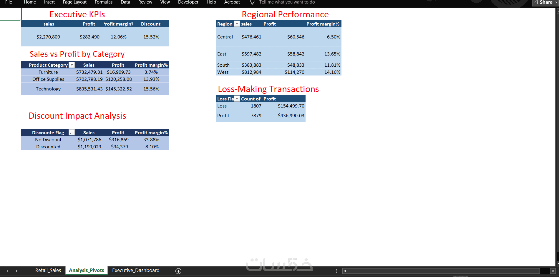 يتم تنفيذ العمل بالكامل داخل Excel باستخدام جداول محورية ورسومات واضحة، مع إمكانية التصفية حسب الفترة أو الفئة أو المنطقة.