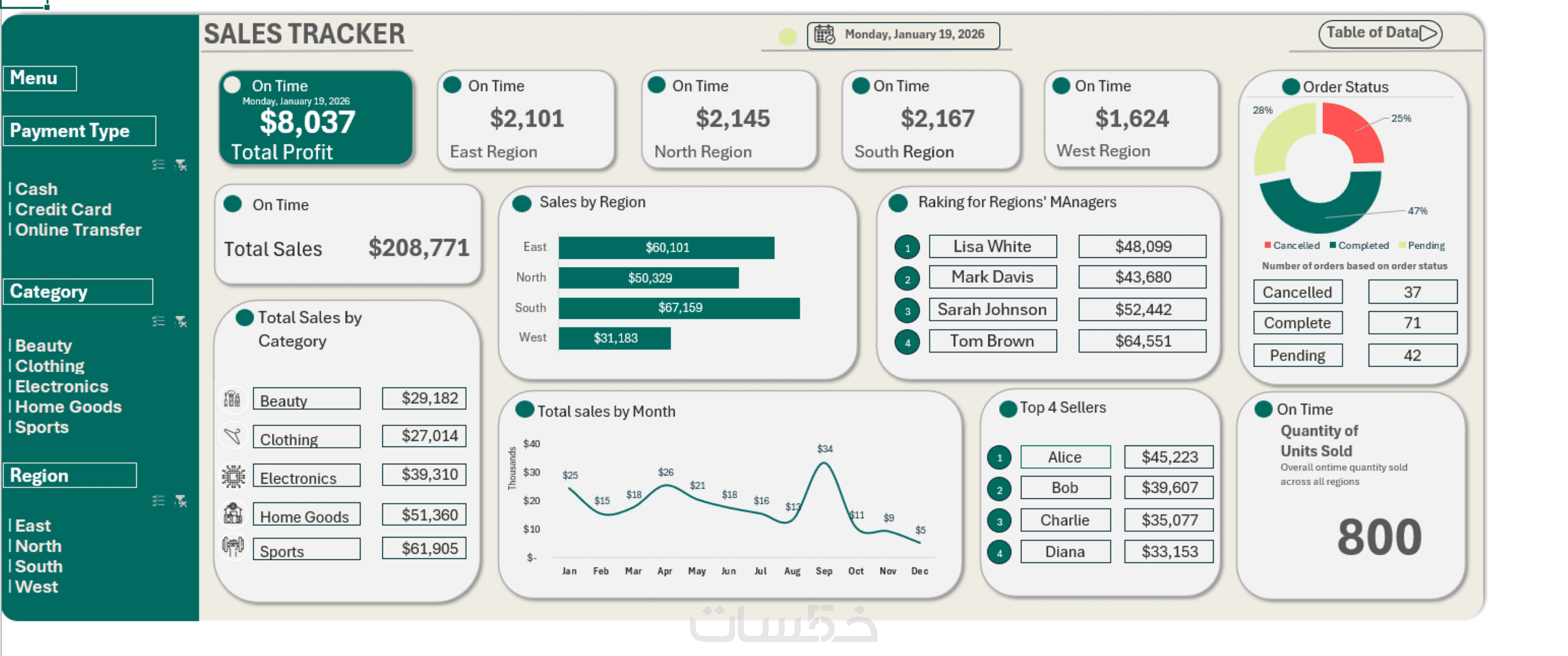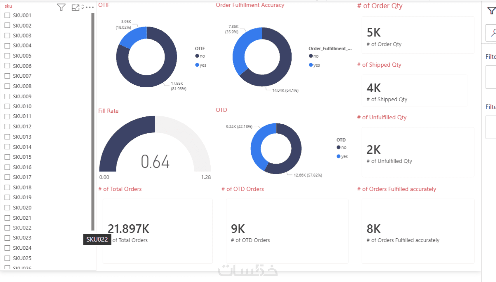 لوحة تحكم فورية لمراقبة اداء سلاسل الإمداد والمبيعات الخاصة بالمناطق المختلفة والمدراء المختلفين مع تحليل اداء للمبيعات الشهرية بالإضافة الى حالات الطلبيات المختلفة وعدد الكميات المباعة لكل فئة وكل منطقة باستخدام باور بي اي (Power BI) واكسيل (Excel)