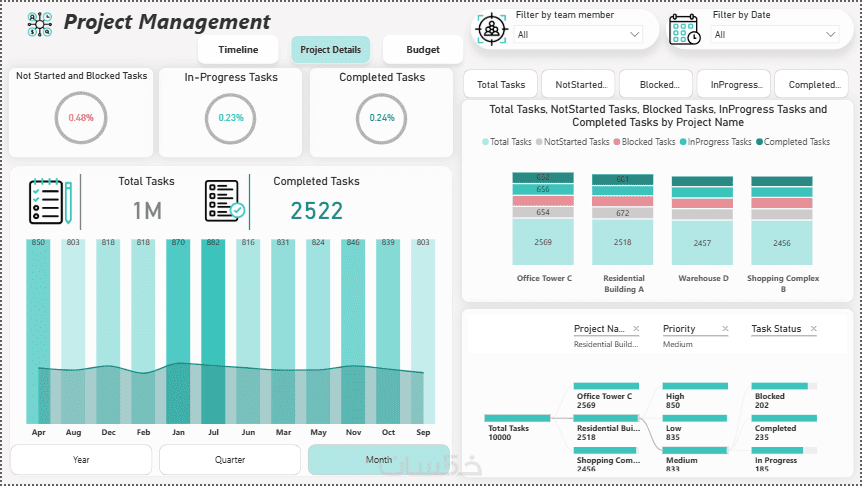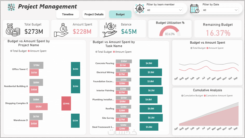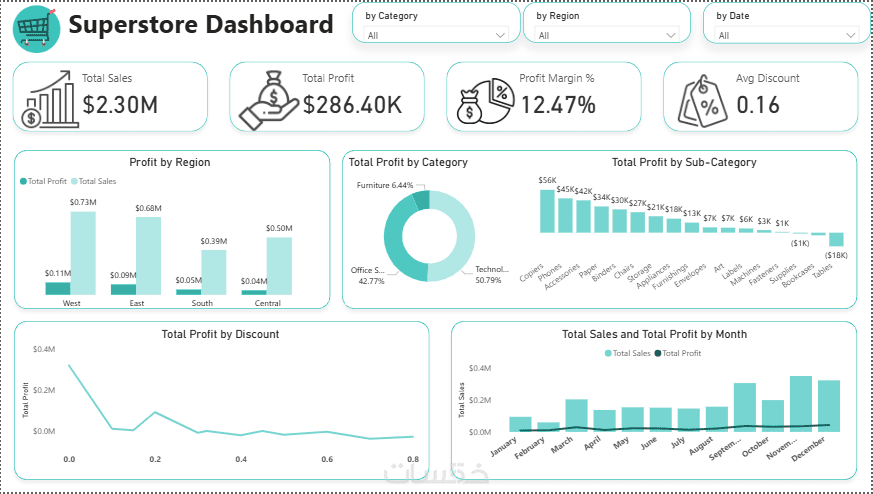 - تفاعلية اللوحة: إضافة فلاتر (Slicers) تتيح لك التحكم في عرض البيانات (حسب التاريخ، المنتج، أو المنطقة) بضغطة زر.
