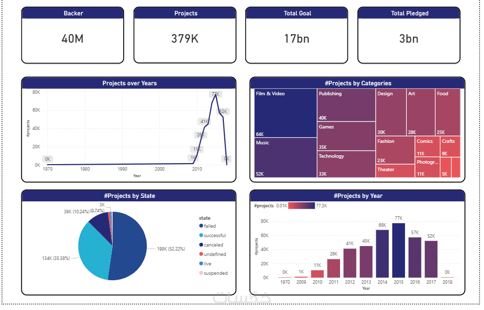 أقدم لك خدمة تصميم Dashboard تفاعلي ومخصص باستخدام أدوات تحليل البيانات مثل Power BI ، يعرض مؤشرات الأداء الرئيسية (KPIs) مثل عدد الداعمين، إجمالي المشاريع، الأهداف، والمبالغ المجمعة، بالإضافة إلى رسوم بيانية توضح التوزيع حسب السنوات، الفئات، وحالة المشاريع.