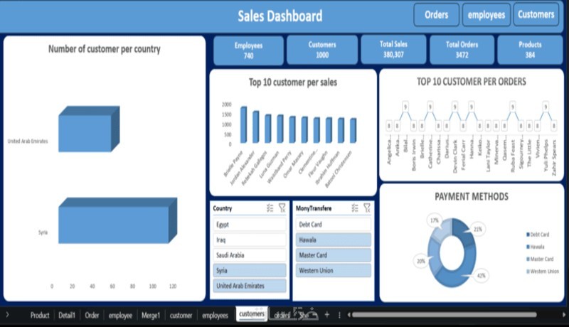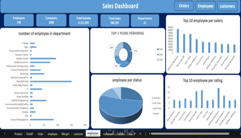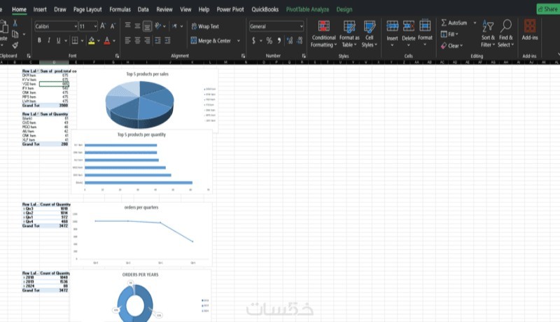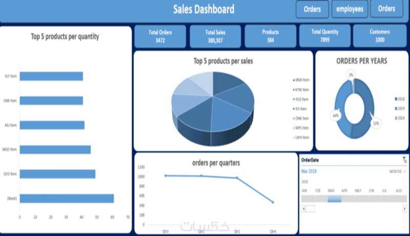 صميم رسوم بيانية ذكية توضح أفضل المنتجات وأداء الموظفين مع "فلاتر زمنية" لتحديث الأرقام بمجرد الضغط على السنة أو الشهر و تنظيم وتنسيق جداول البيانات وعرض أهم المؤشرات (إجمالي المبيعات، عدد الطلبات، والعملاء) بشكل بصري جذاب وسهل الفهم.