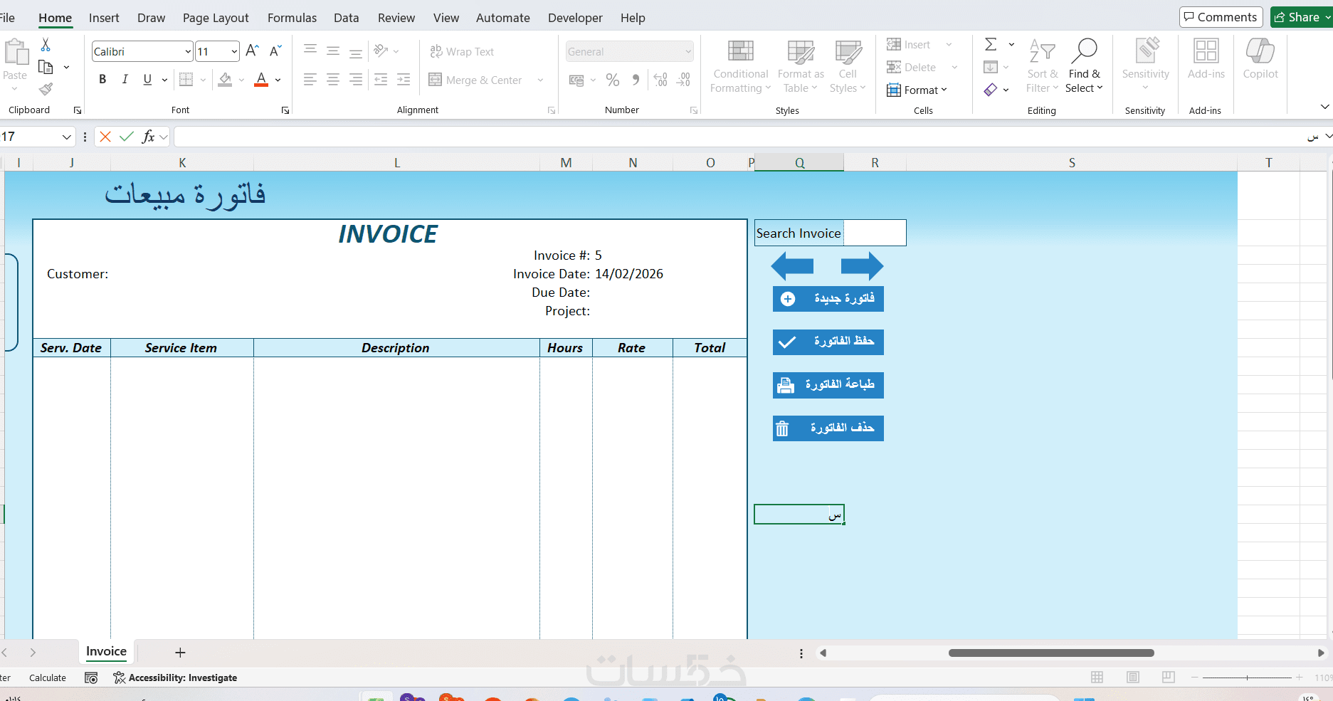 .4 نموذج فاتورة: تصميم نموذج فاتورة إلكترونية واحدة (Template) على الإكسل جاهزة للطباعة والتحويل لـ PDF.