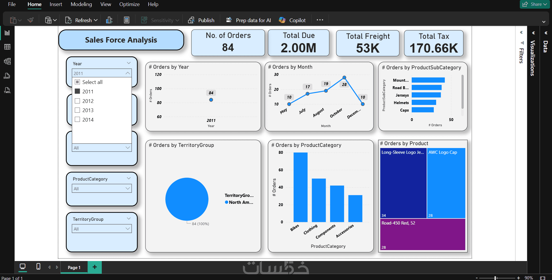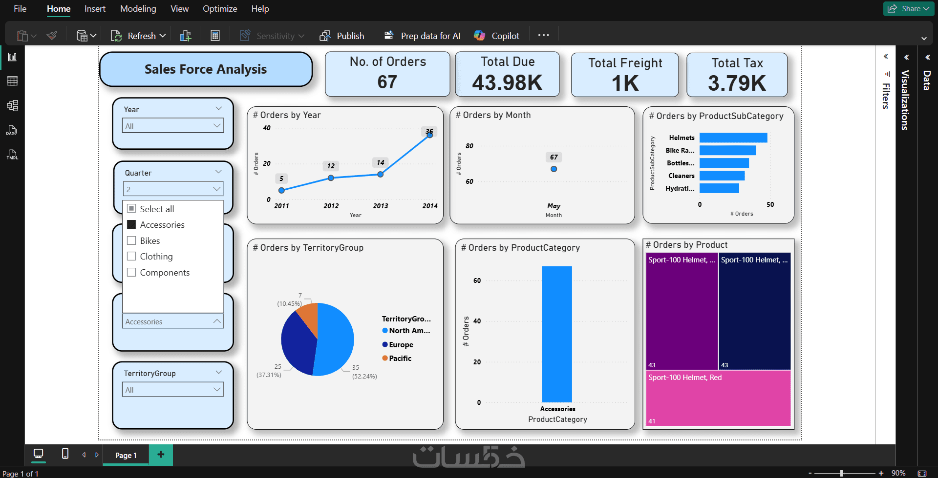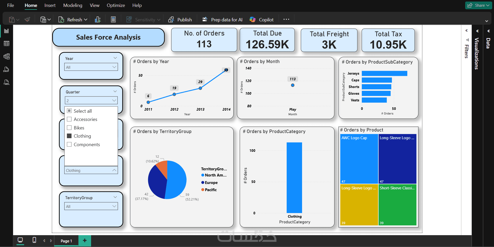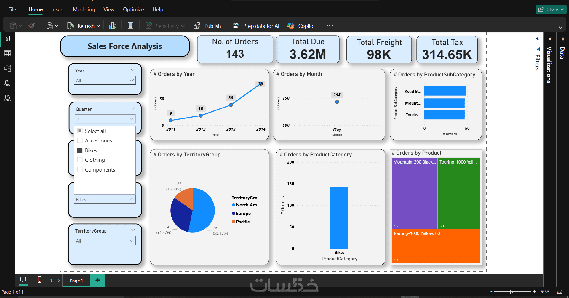 يعرض هذا المشروع لوحة بيانات تفاعلية (Dashboard) صُممت باستخدام Power BI لتحليل أداء فريق المبيعات. تتضمن اللوحة مؤشرات الأداء الرئيسية (KPIs) مثل إجمالي عدد الطلبات، الإيرادات، والضرائب. تم تصميم رسوم بيانية توضح اتجاهات المبيعات عبر السنوات والأشهر، مع تقسيم تفصيلي للمبيعات حسب المناطق الجغرافية وفئات المنتجات (مثل الملابس، الدراجات، والإكسسوارات). توفر اللوحة فلاتر ديناميكية تتيح للمستخدم استخراج تقارير دقيقة لدعم اتخاذ القرار.