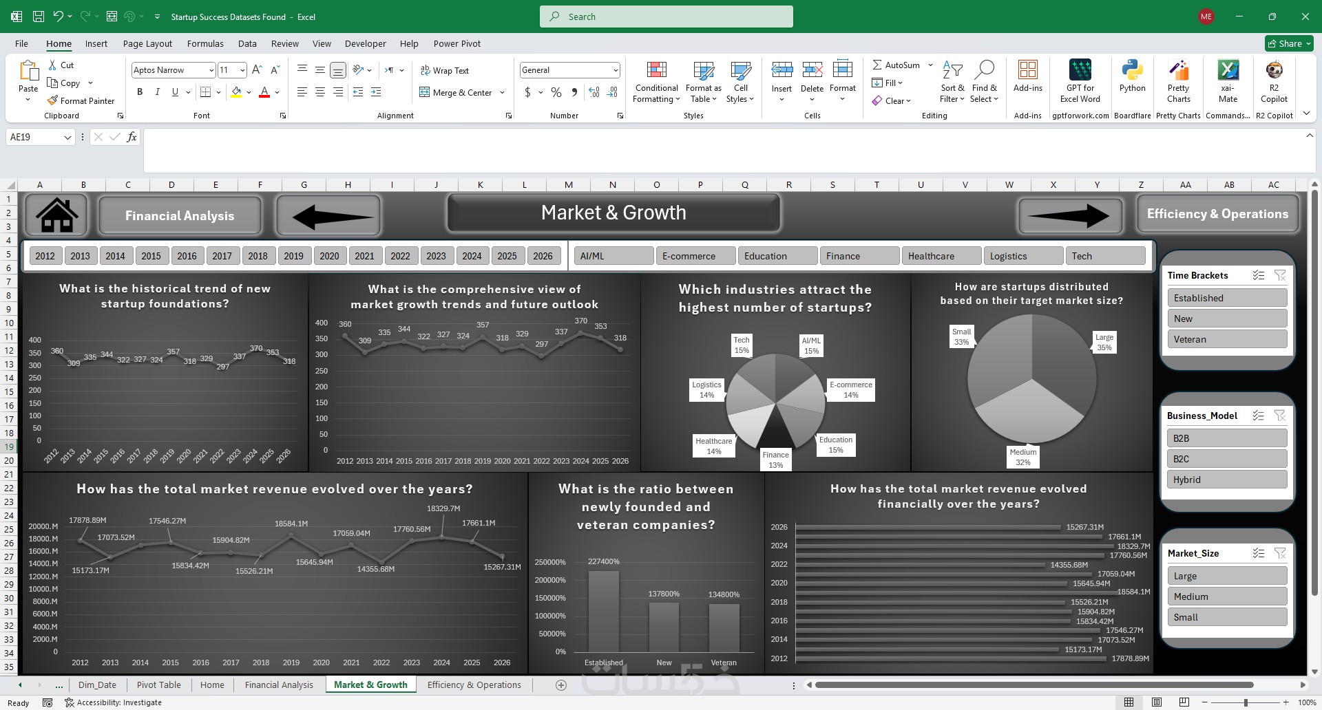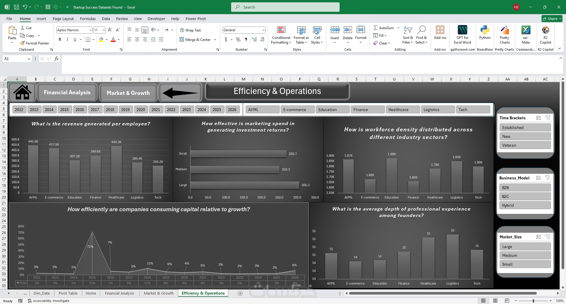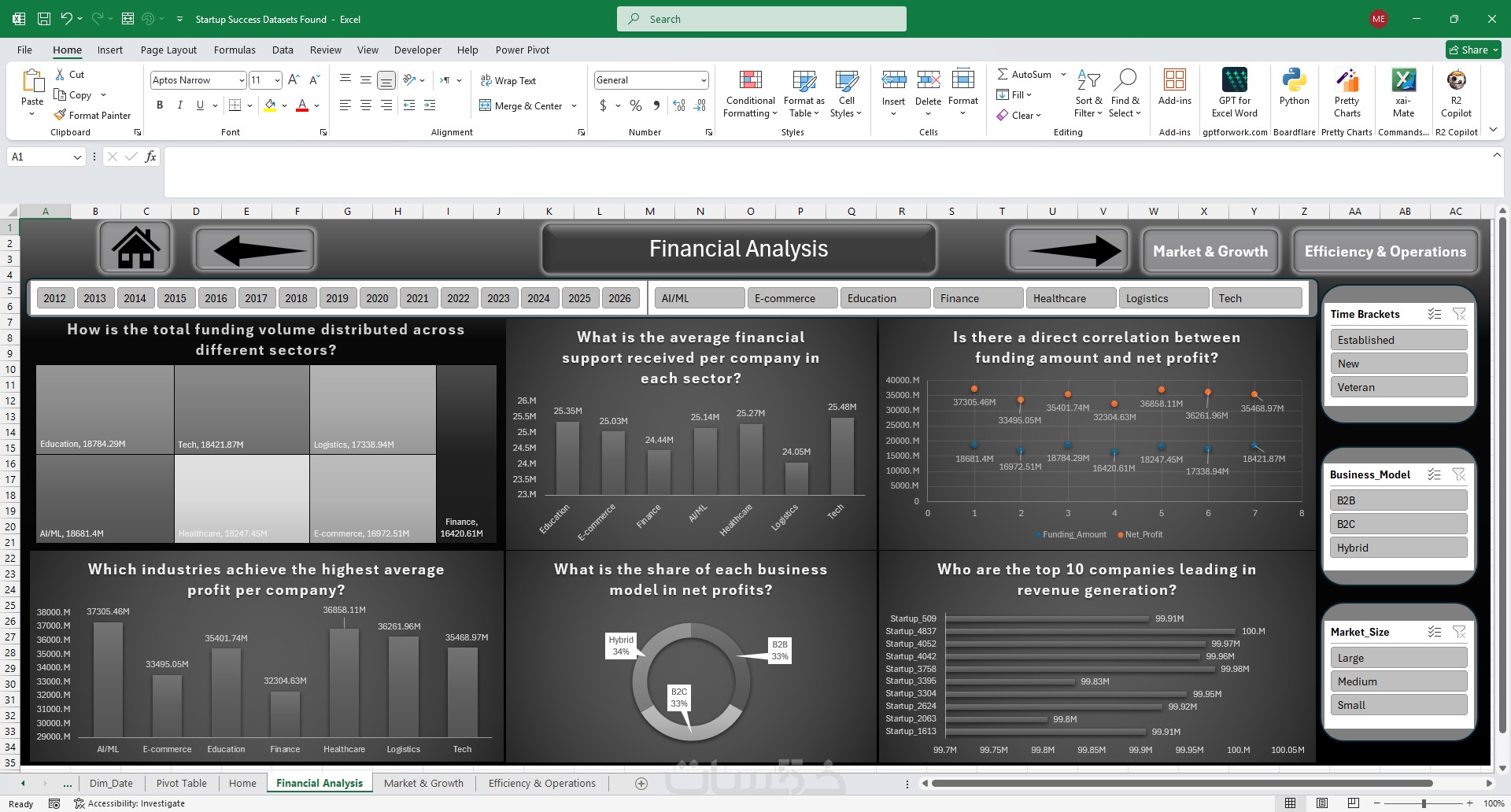 أدوات تصفية ذكية (Dynamic Slicers): تمكنك من التنقل بين السنوات، القطاعات، والمناطق الجغرافية بضغطة زر واحدة لتحديث كافة الرسوم البيانية فوراً.