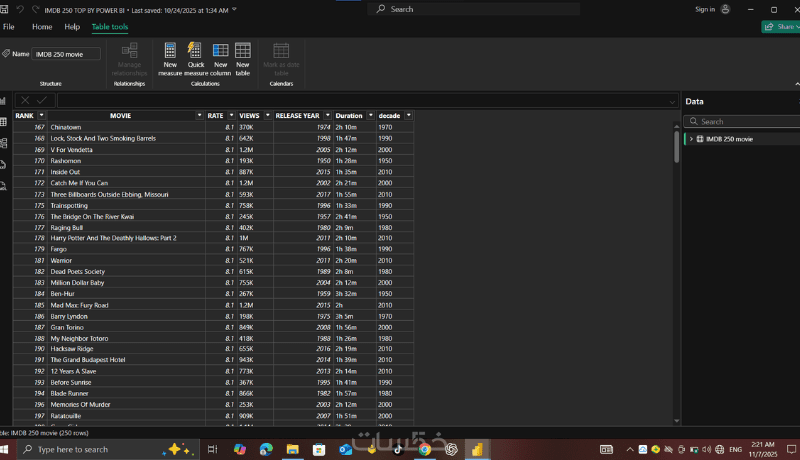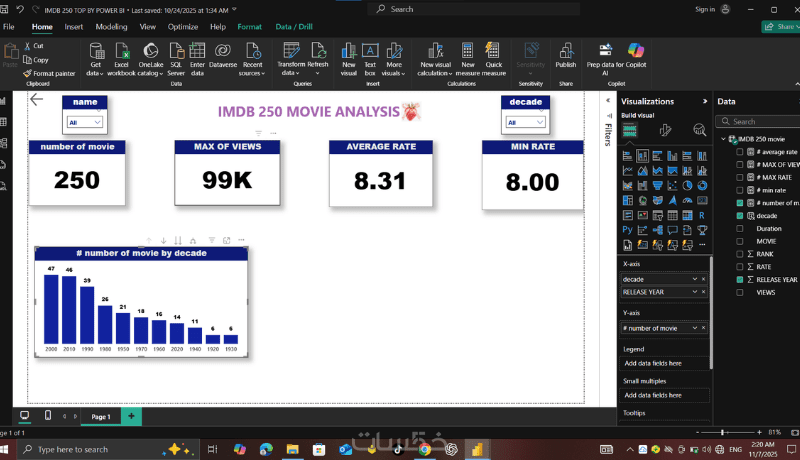 سأقوم بتحليل بيانات أفلام IMDB باستخدام Power BI وتحويلها إلى Dashboard تفاعلي يعرض أهم المؤشرات مثل التقييمات، عدد المشاهدات، أفضل الأفلام، وتوزيع الأفلام حسب السنة أو النوع.