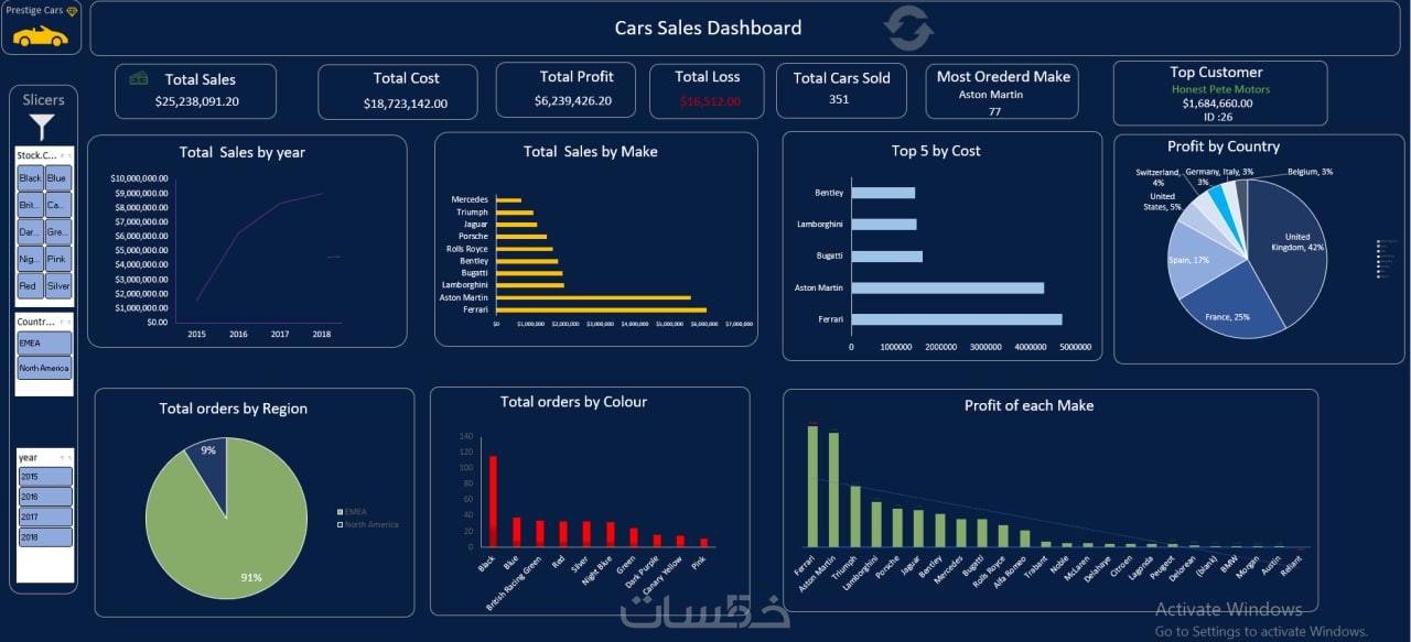 بالإضافة إلى ذلك، تم إعداد تقارير تفاعلية تبين إجمالي المبيعات، المكاسب، الخسائر، وعدد السيارات المباعة لكل طراز، باستخدام أدوات التحليل البصري لتسهيل اتخاذ القرارات المبنية على البيانات