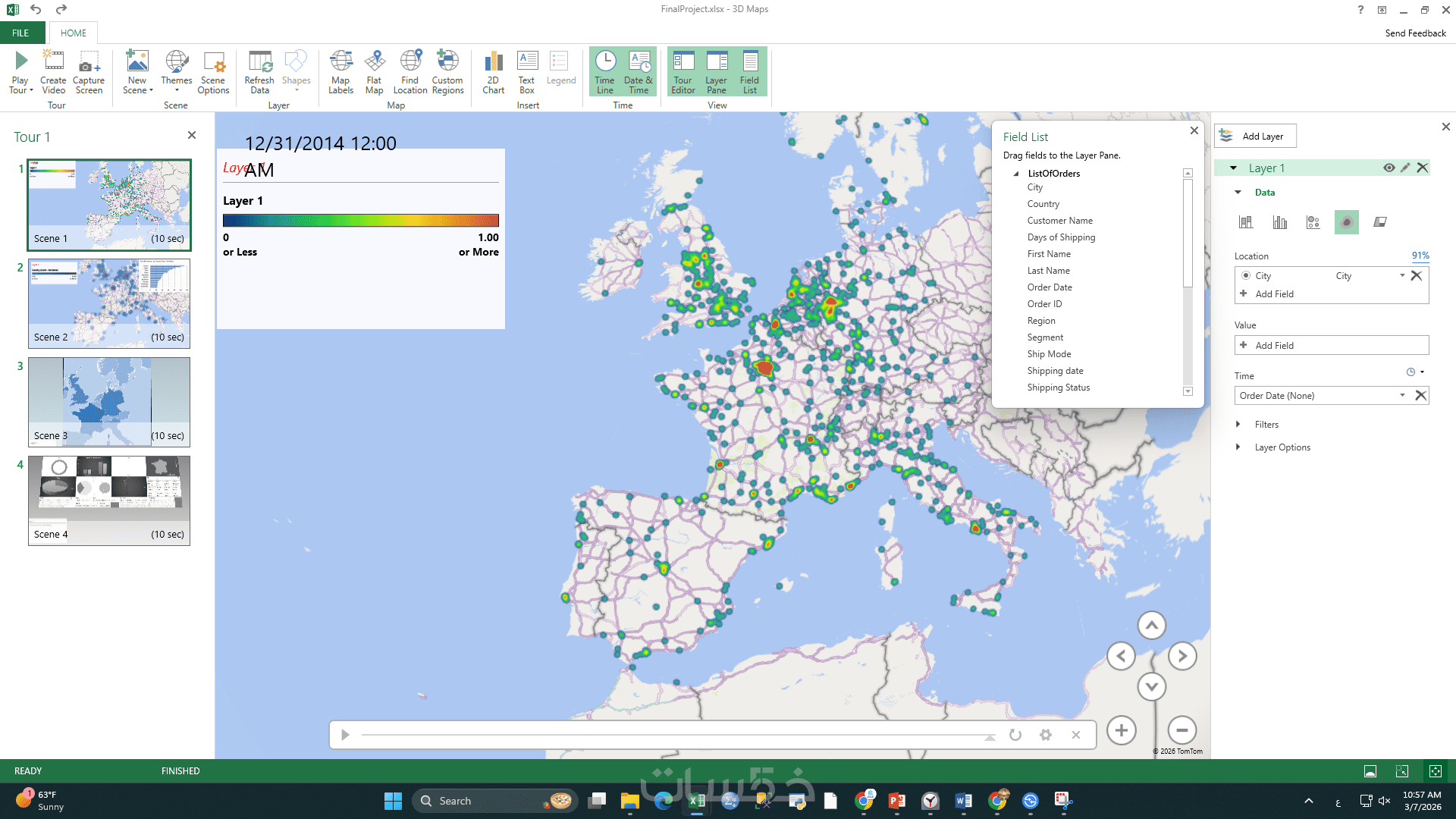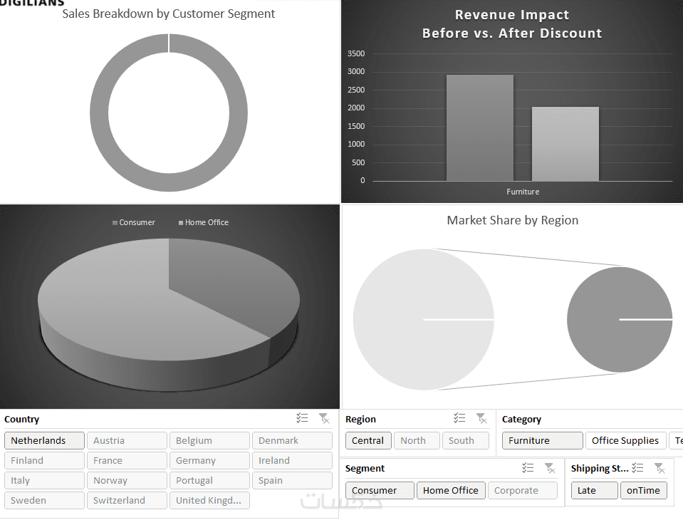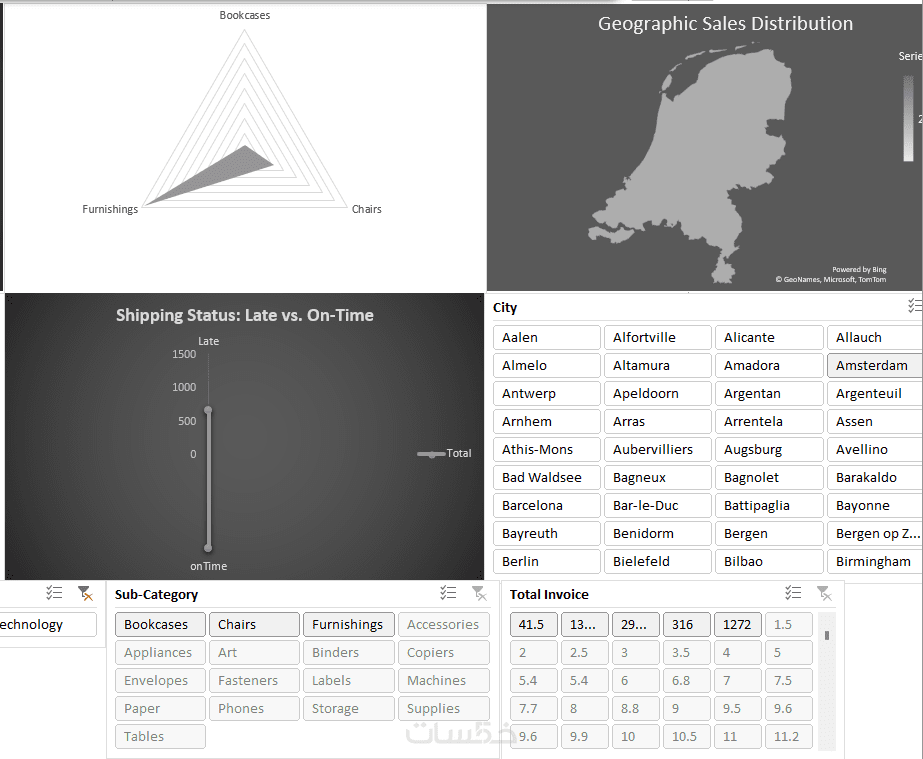 أدوات تصفية ذكية (Slicers): أزرار تفاعلية تتيح لك تصفية البيانات (مثلاً حسب التاريخ، المنطقة، أو المنتج) وتحديث الرسوم البيانية تلقائياً أمامك.