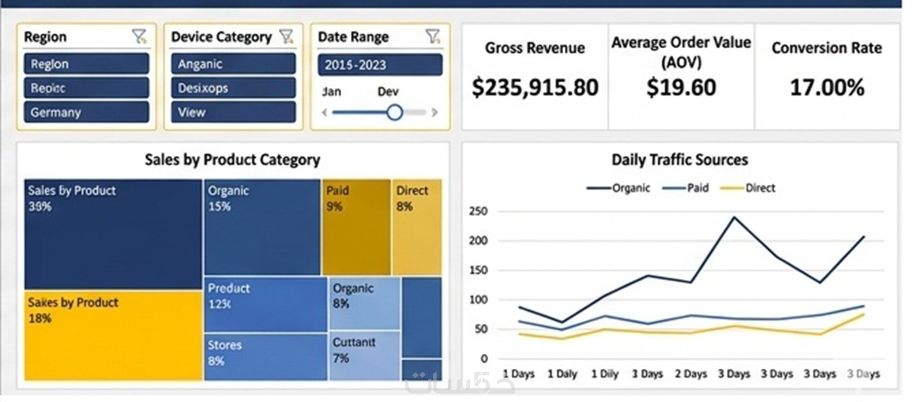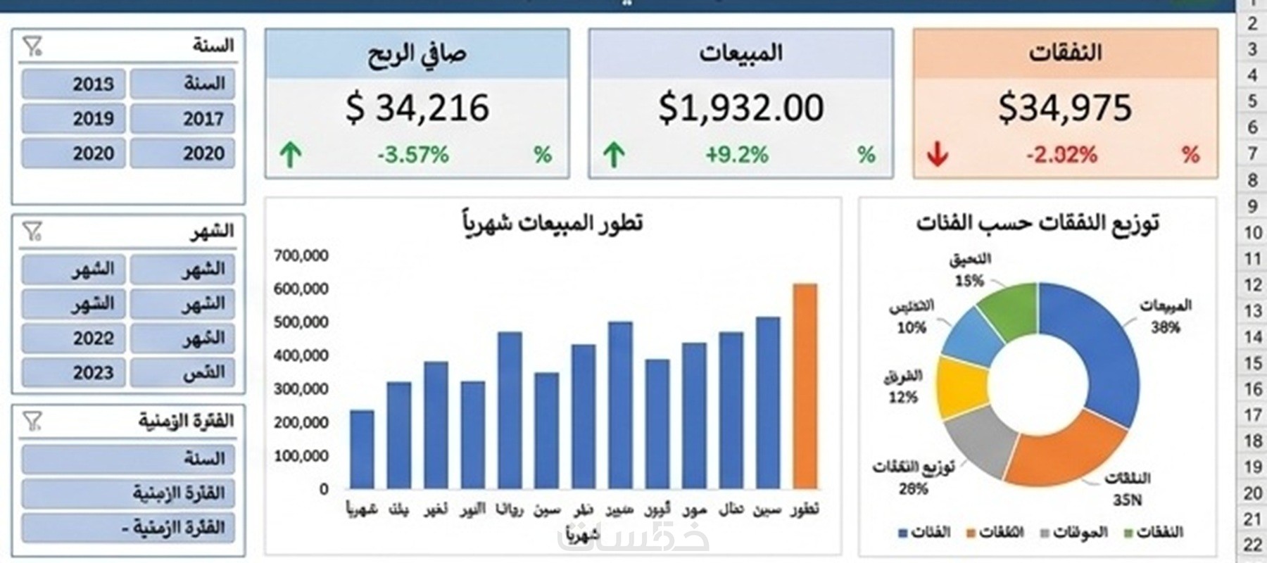 - إضافة Slicers (أدوات تصفية) لتمكينك من عرض البيانات حسب (التاريخ، المنطقة، المنتج، إلخ) بضغطة زر.