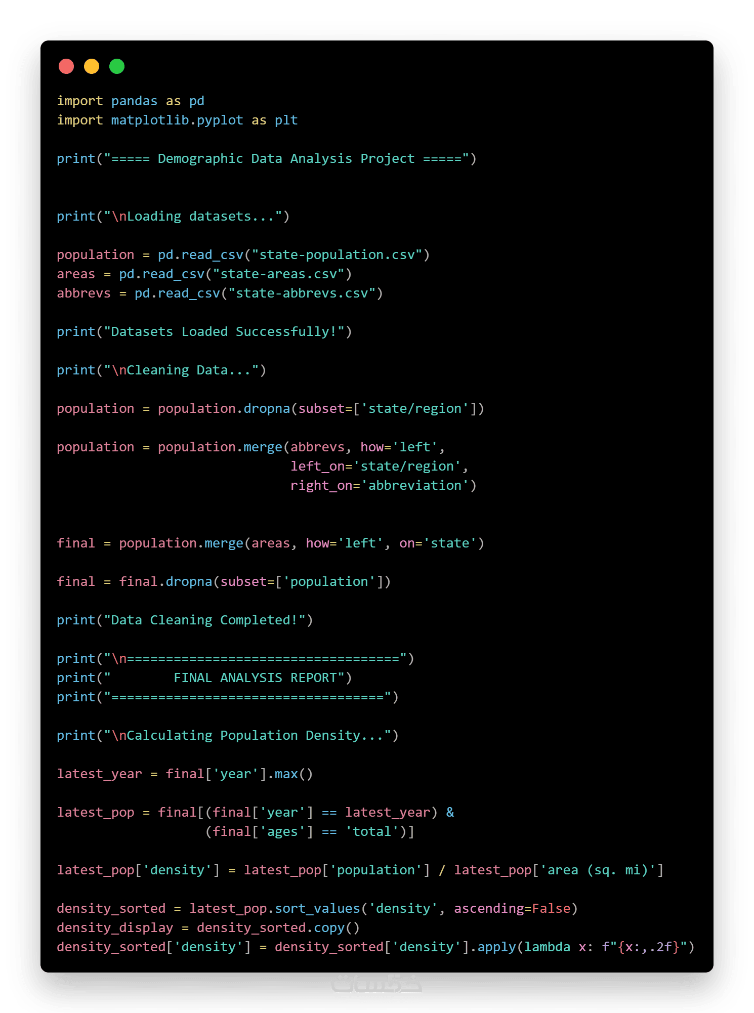 تشمل الخدمة تنظيف البيانات (Data Cleaning) من القيم المفقودة أو غير الصحيحة، وتجهيزها للتحليل، بالإضافة إلى تحليل البيانات واستخراج أهم المؤشرات والإحصائيات (EDA)، مع تقديم النتائج بشكل بصري باستخدام مكتبة Matplotlib لتسهيل فهم العلاقات والأنماط داخل البيانات.