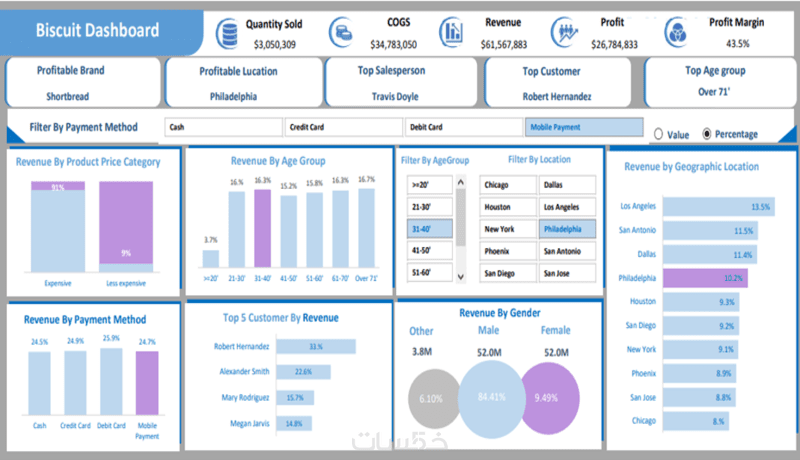 بدل عرض الأرقام كجدول فقط، داشبوردك سيكون مصمم ليتيح متابعة ومقارنة البيانات بشكل تفاعلي,يتضمن Filters, KPIs, Layouts
