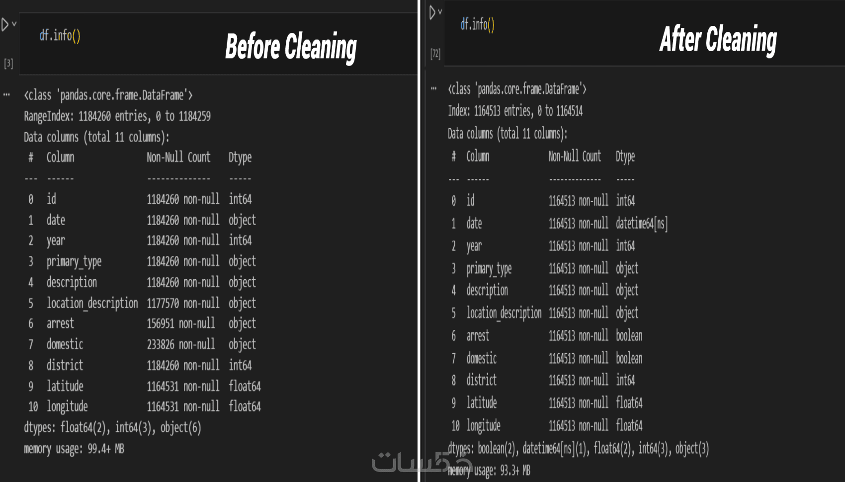 - تنظيف البيانات (Data Cleaning): التعامل مع القيم المفقودة (Null values) سواء بالحذف أو التعويض (Imputation) ، وتصحيح أنواع البيانات (Data Types) لضمان دقة المعالجة الحسابية والزمنية.