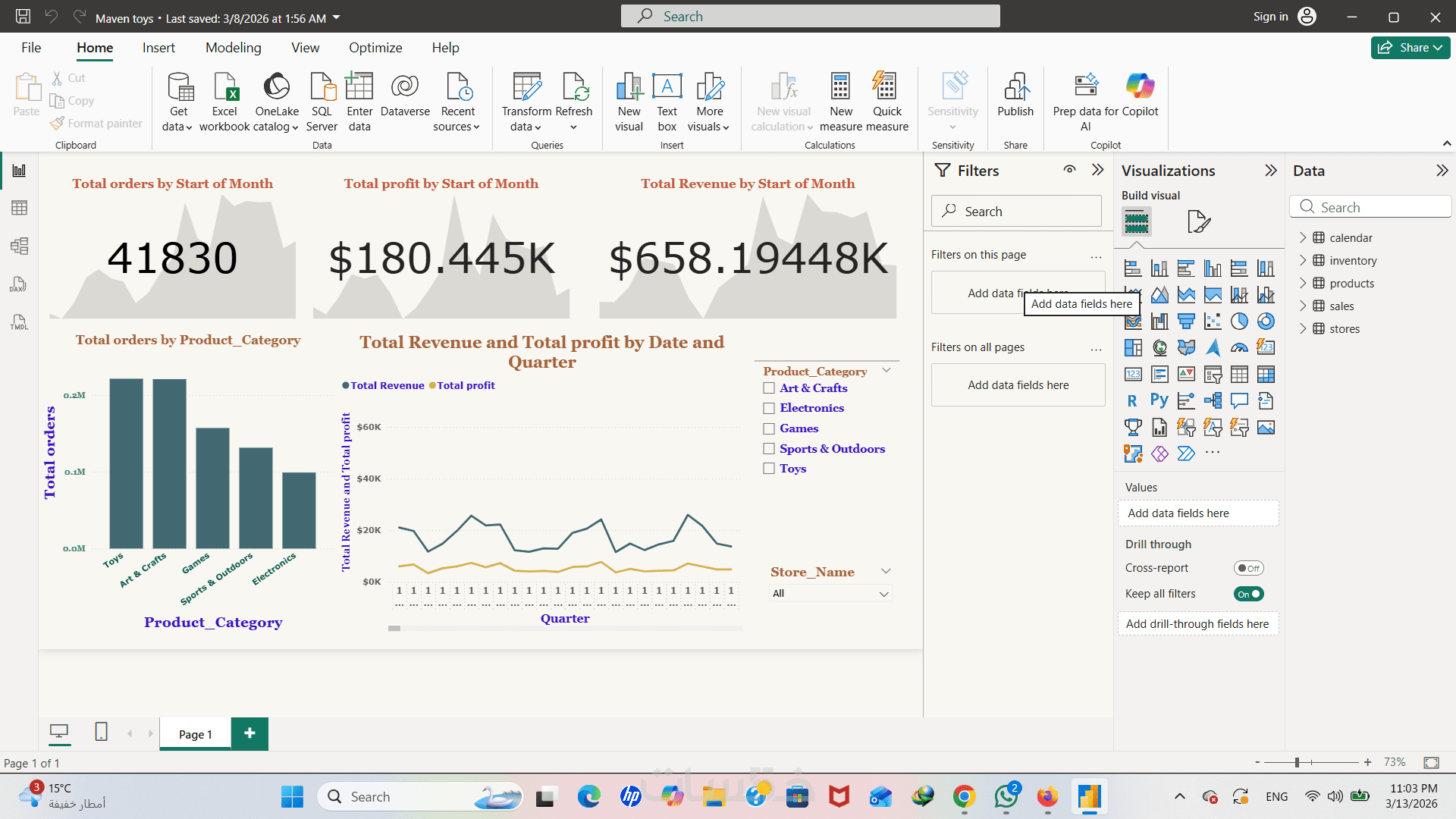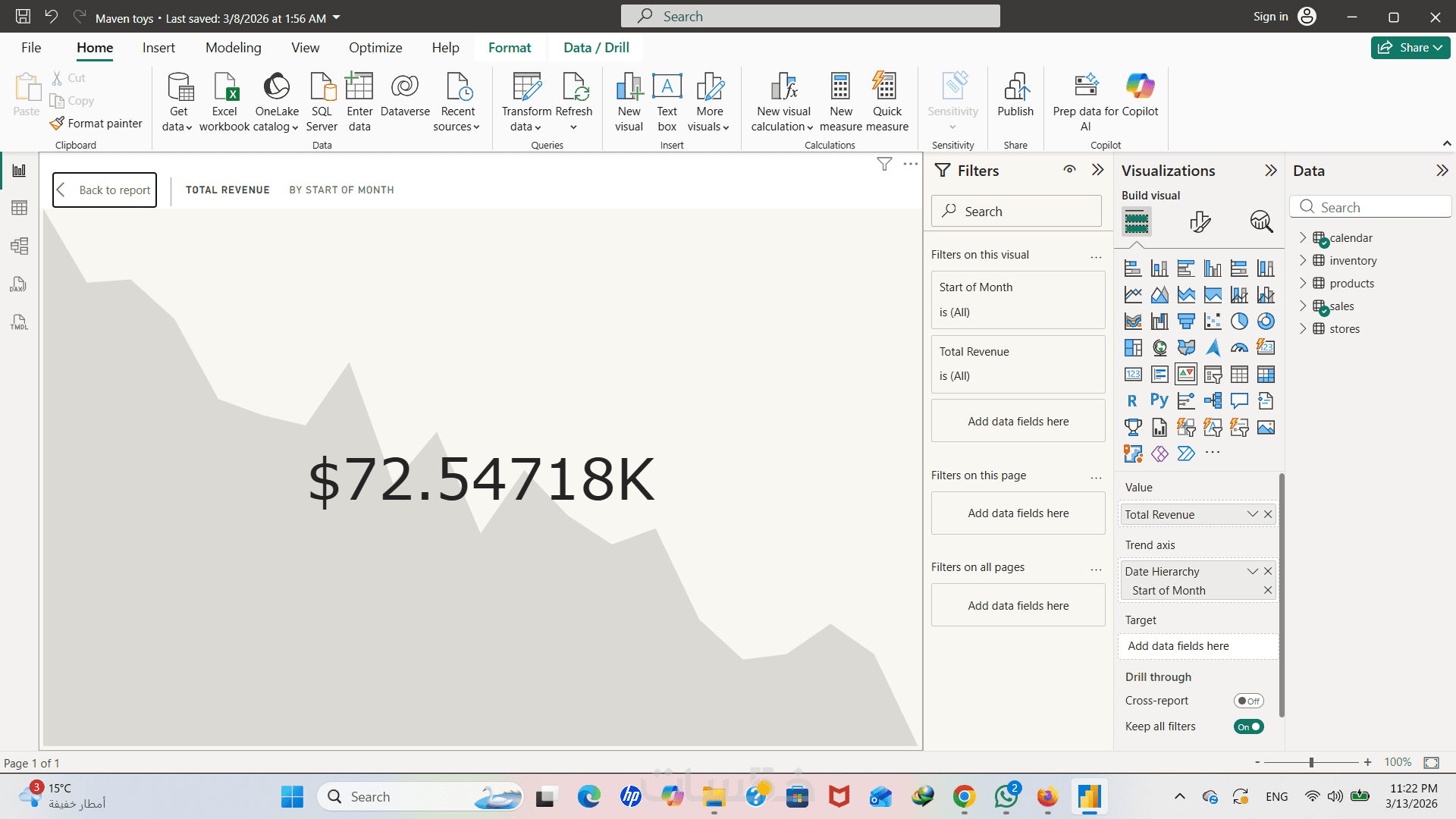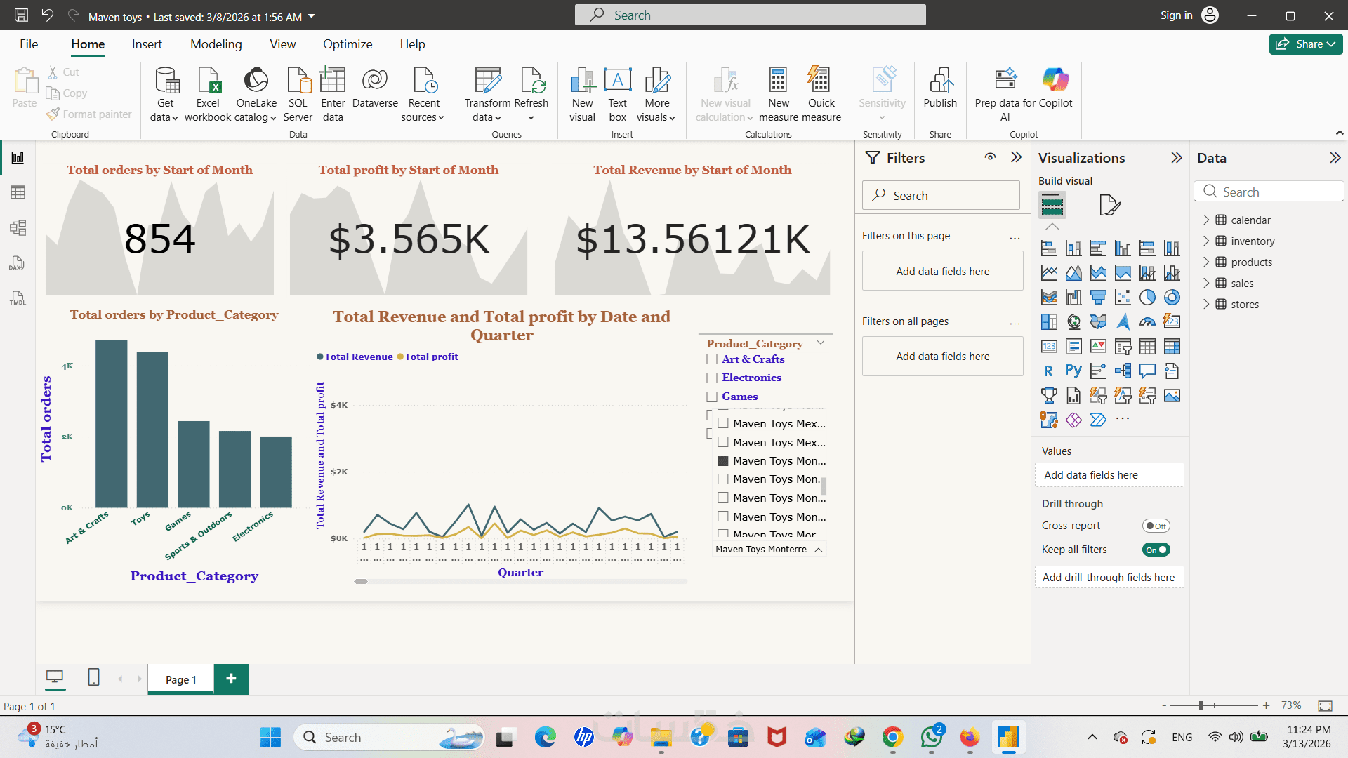 ستحصل على لوحة بيانات مزودة بفلاتر (Slicers) ذكية، تمكنك من تصفية النتائج حسب التاريخ، نوع المنتج، أو المنطقة الجغرافية كما يظهر في نموذج أعمالي.