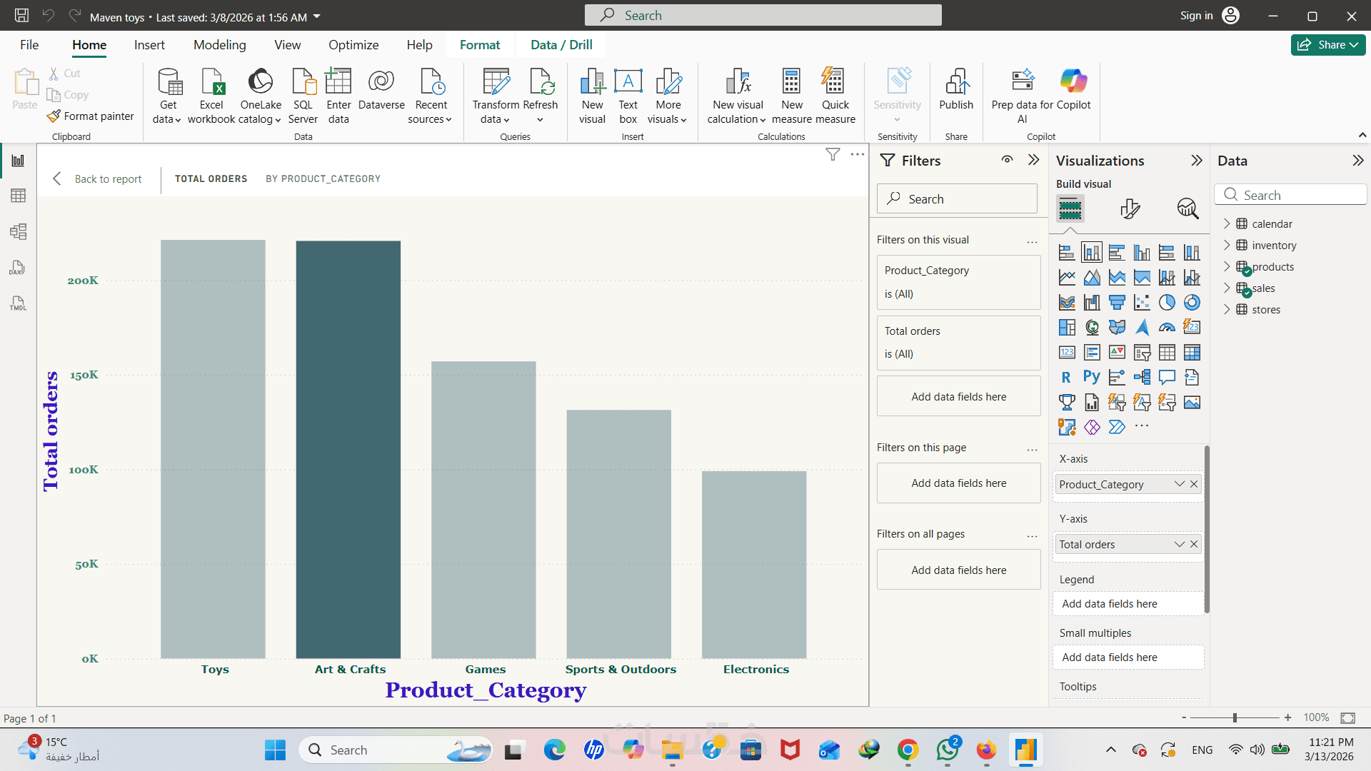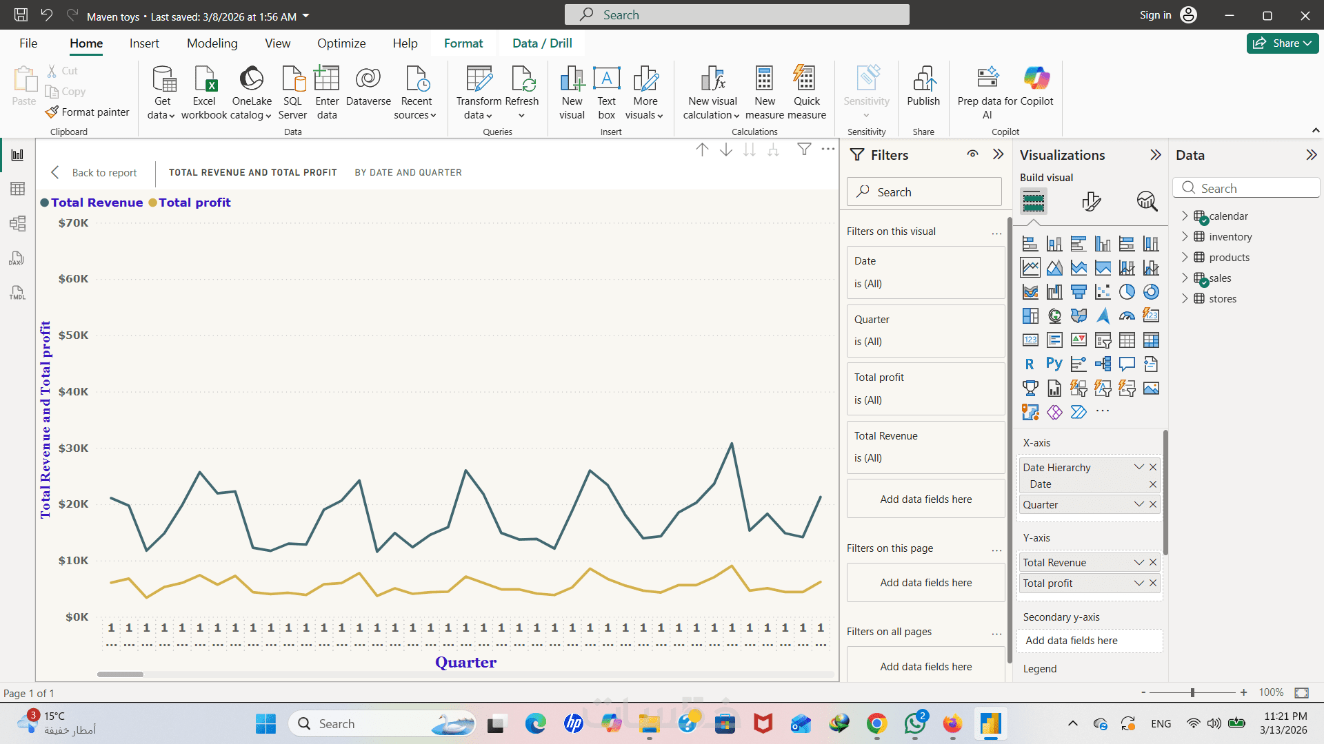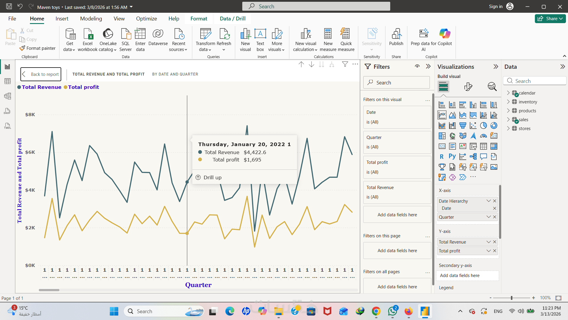 ستحصل على لوحة بيانات مزودة بفلاتر (Slicers) ذكية، تمكنك من تصفية النتائج حسب التاريخ، نوع المنتج، أو المنطقة الجغرافية كما يظهر في نموذج أعمالي.