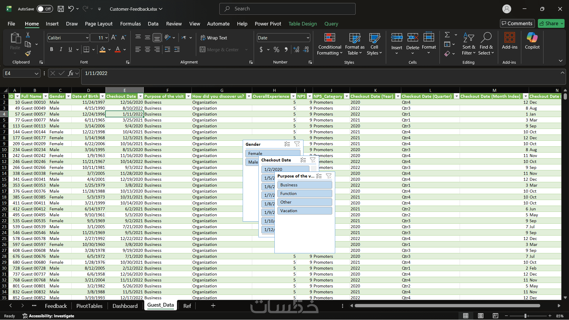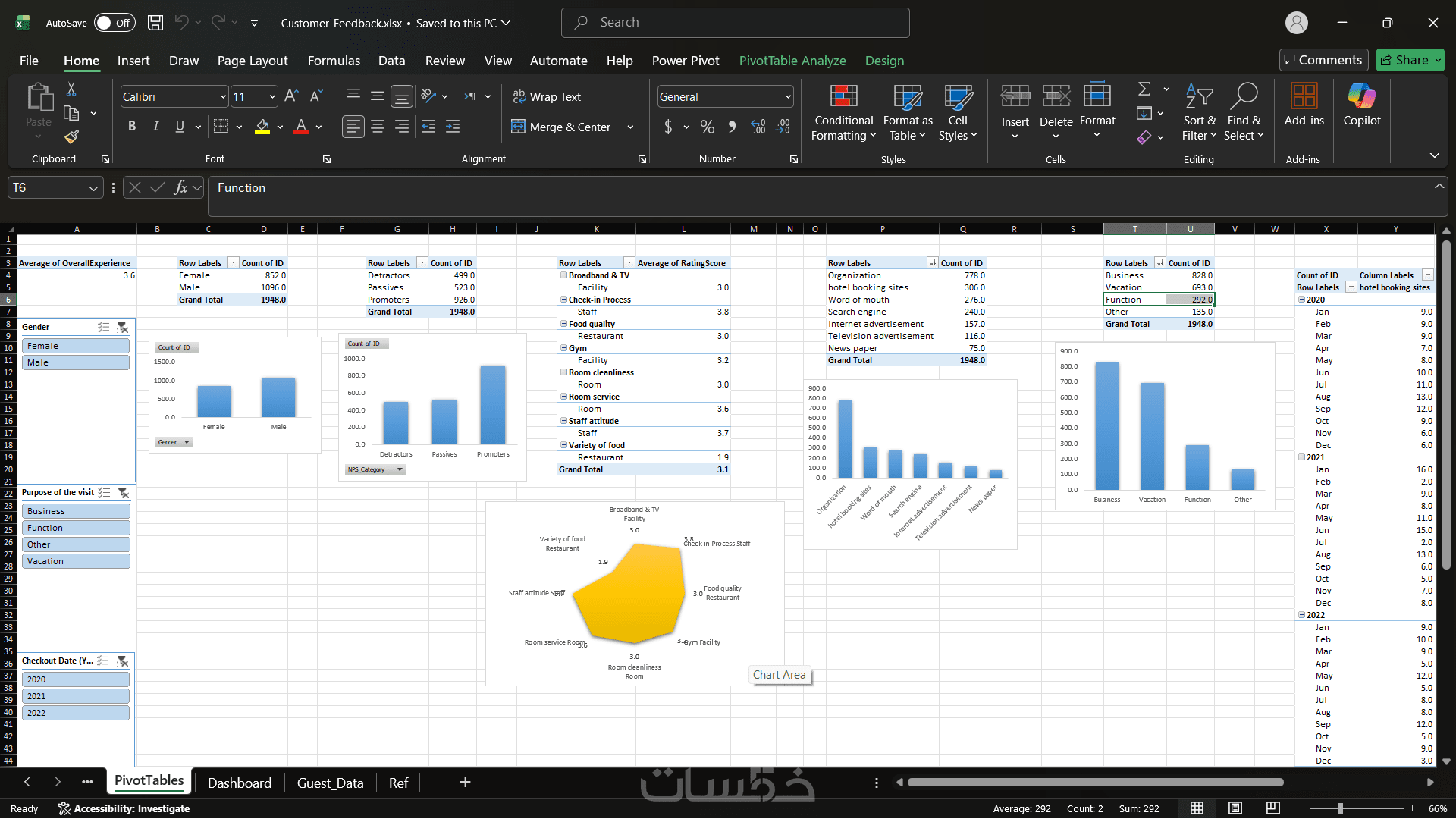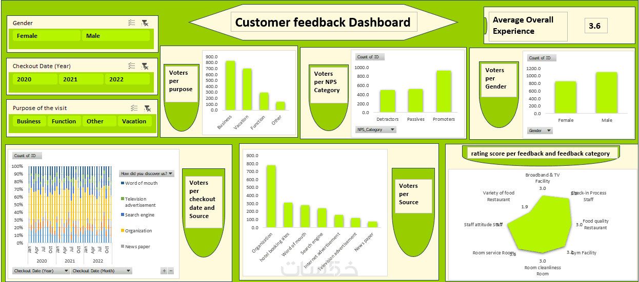 بعد ذلك، أصمم لك داشبورد تفاعلي (Dynamic Dashboard) مزوداً بـ Slicers ورسوم بيانية (Charts) مبتكرة، مما يتيح لك مراقبة مؤشرات الأداء وفلترة النتائج بضغطة زر واحدة وبكل سهولة.
