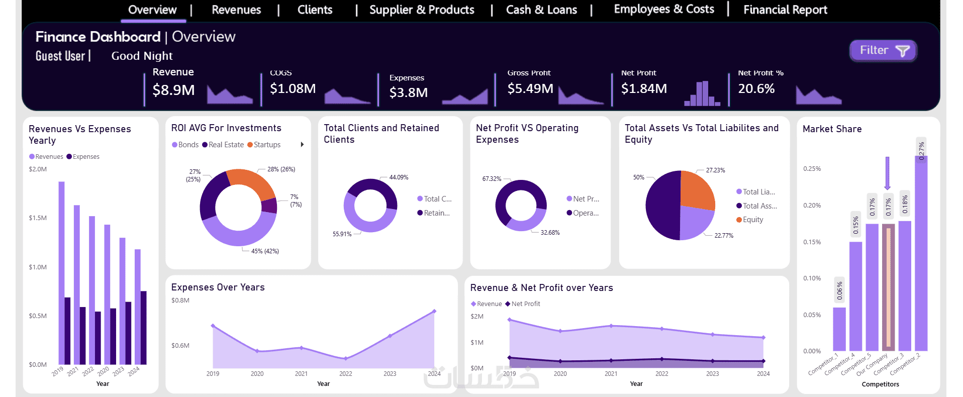 تقرير مرئى او لوحة المعلومات التفاعليه مكون من عدد 1صفحة بها 4-6 رسوم بيانية او يمكن استبدال رسمة بيانية بقيمة معينة Card.