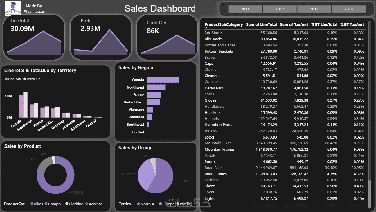 2-تقرير احترافي(PBIX) : لوحة تحكم مصممة بذكاء تحتوي على 5 إلى 7 رسوم بيانية تفاعلية أو ثابتة في الصفحة الواحدة توضح تفاصيل البيانات.