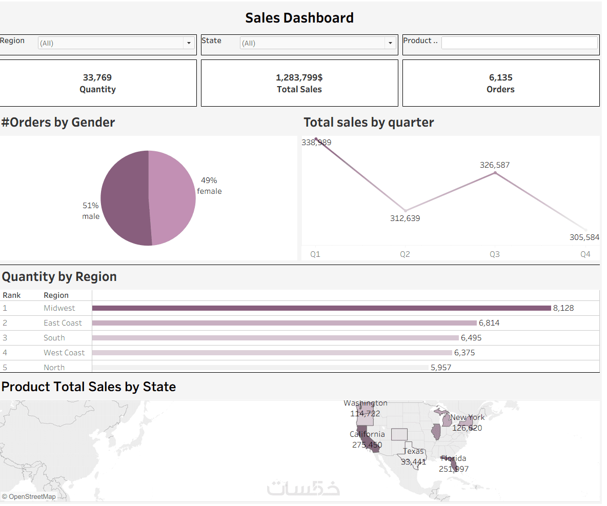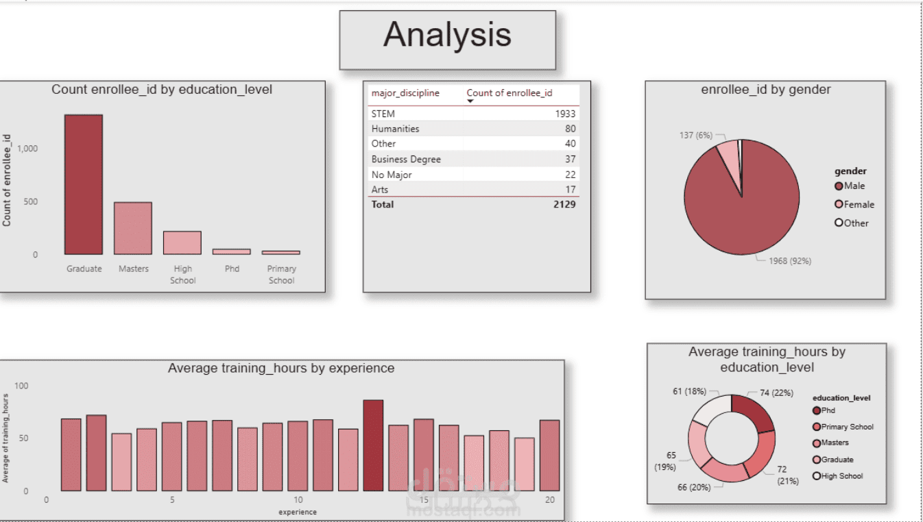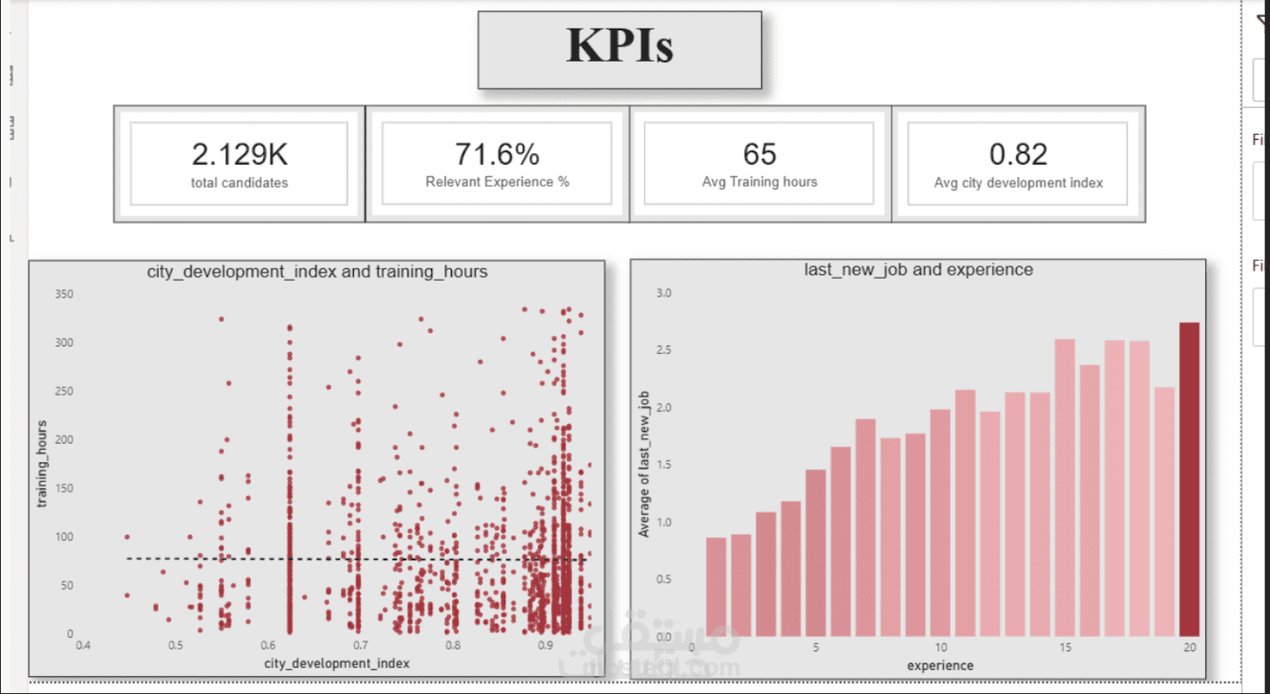 يشمل التصميم صفحة واحدة تحتوي على مجموعة من الرسوم البيانية والمؤشرات الرئيسية مع فلاتر تفاعلية لتسهيل استكشاف البيانات.