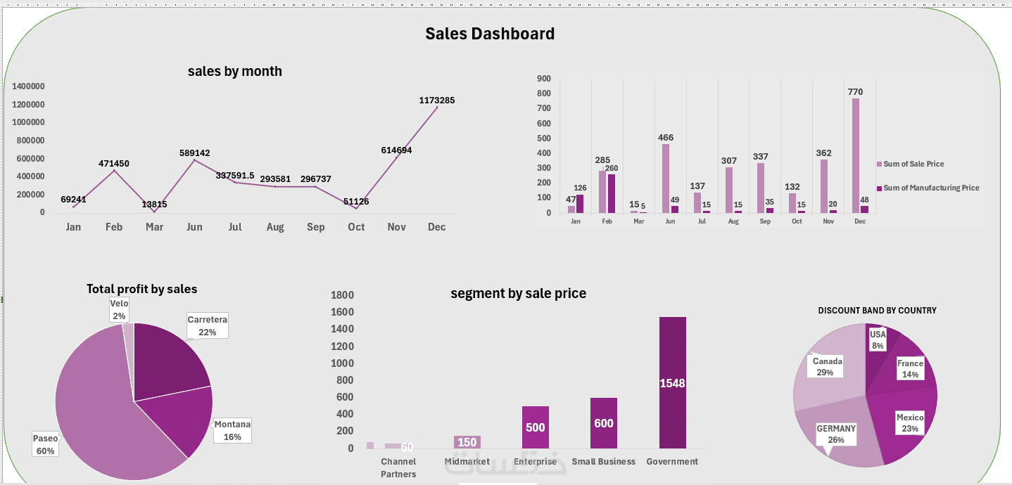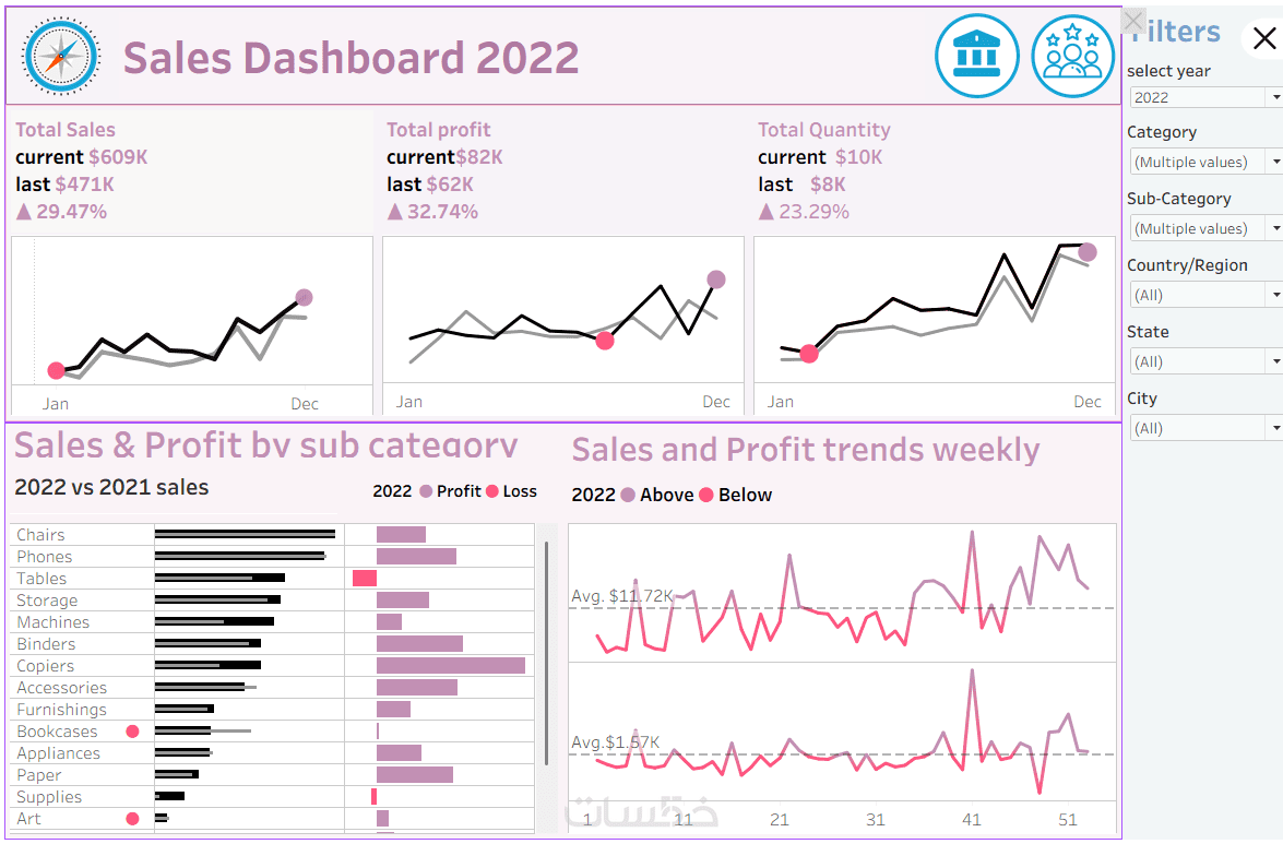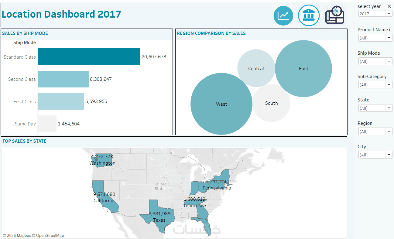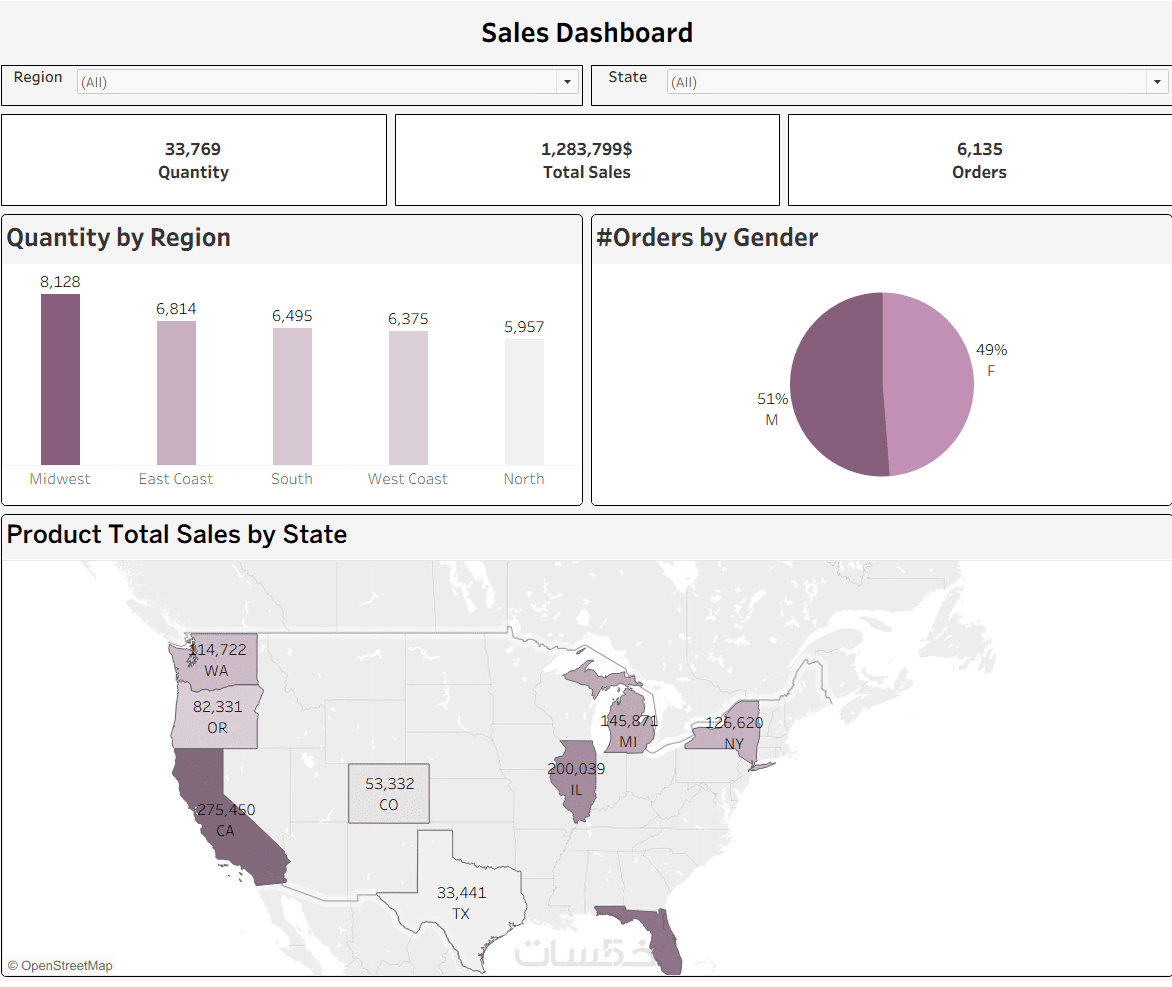 يشمل التصميم صفحة واحدة تحتوي على مجموعة من الرسوم البيانية والمؤشرات الرئيسية مع فلاتر تفاعلية لتسهيل استكشاف البيانات.