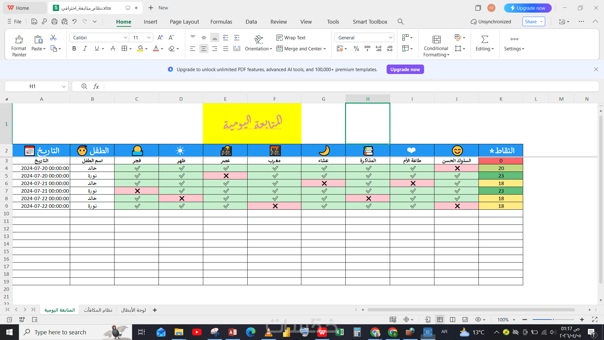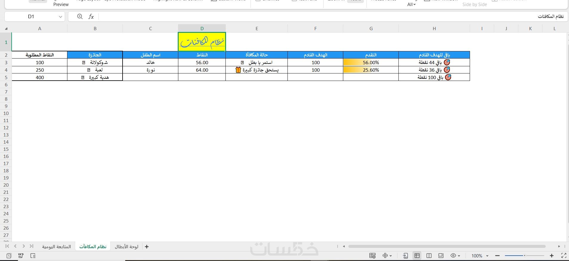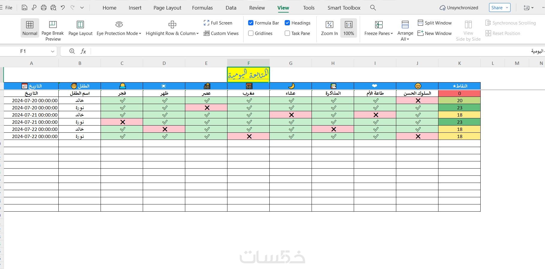 شيت Excel تفاعلي، مصمم لمساعدة أولياء الأمور على متابعة سلوك الأبناء وتعزيز الالتزام بالعادات الإيجابية بطريقة سهلة وممتعة.