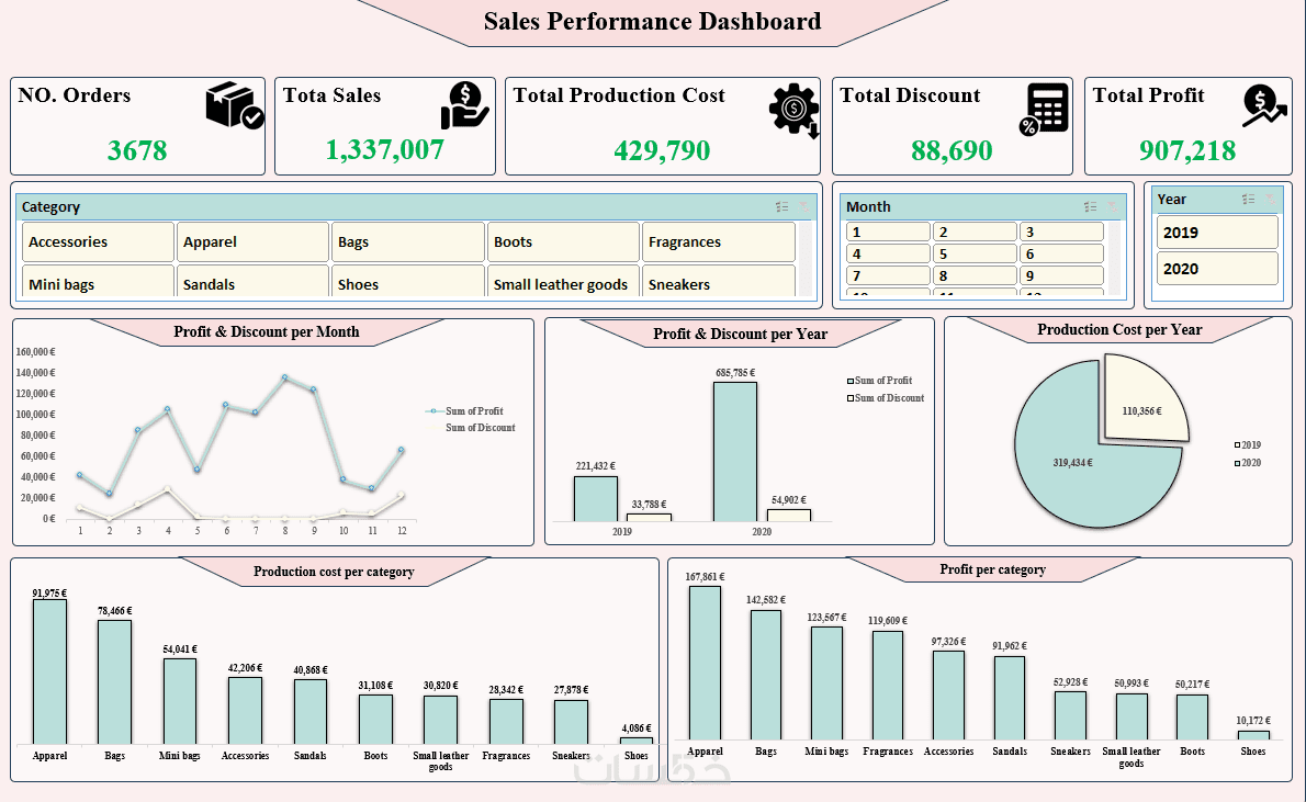 تصميم 5 رسوم بيانية (Charts) احترافية توضح أهم مؤشرات الأداء مع 5 (KPIs).