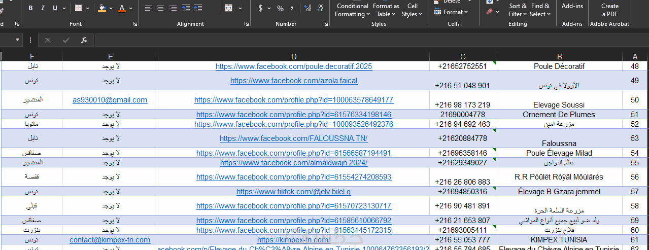تنسيق هذه البيانات في جدول Excel يتكون من 5 أعمدة و 50 صفاً.