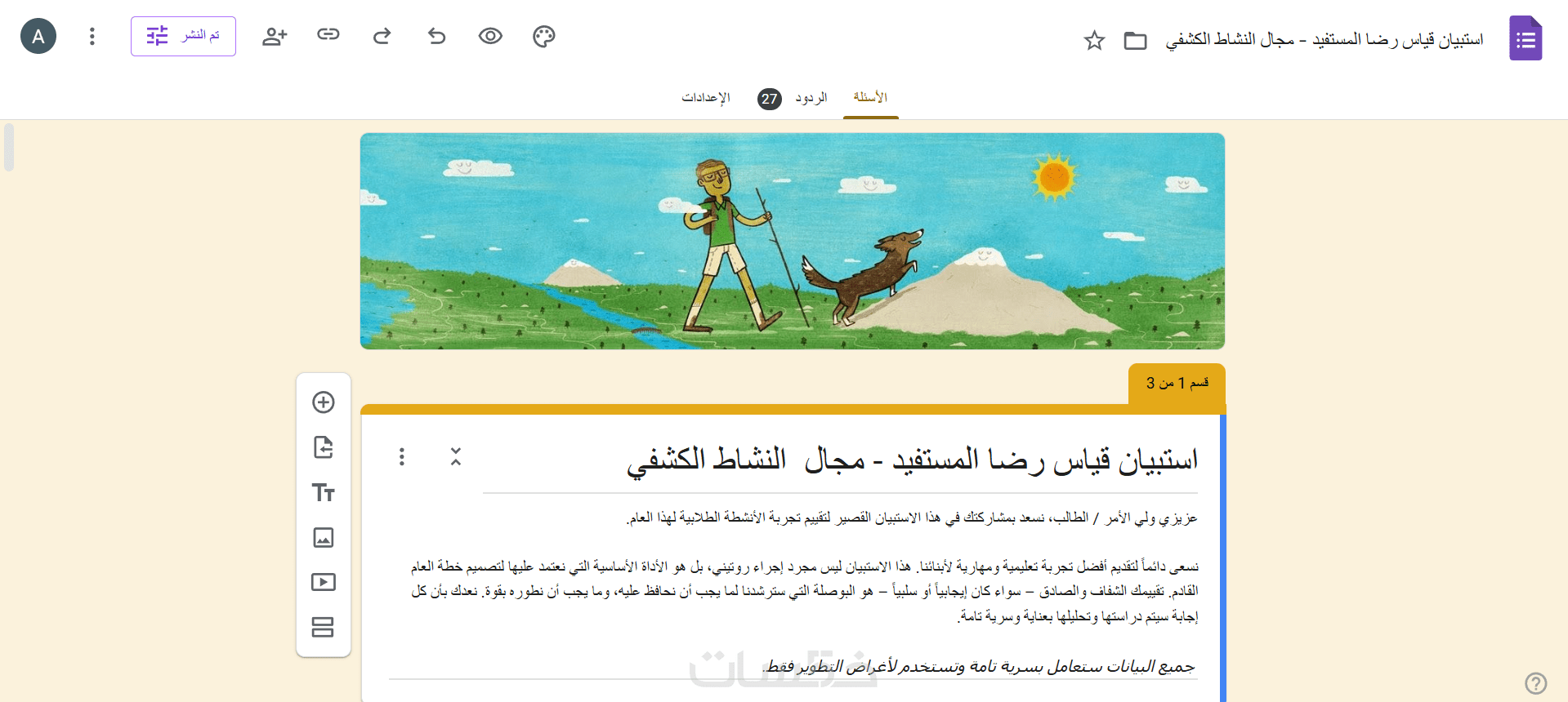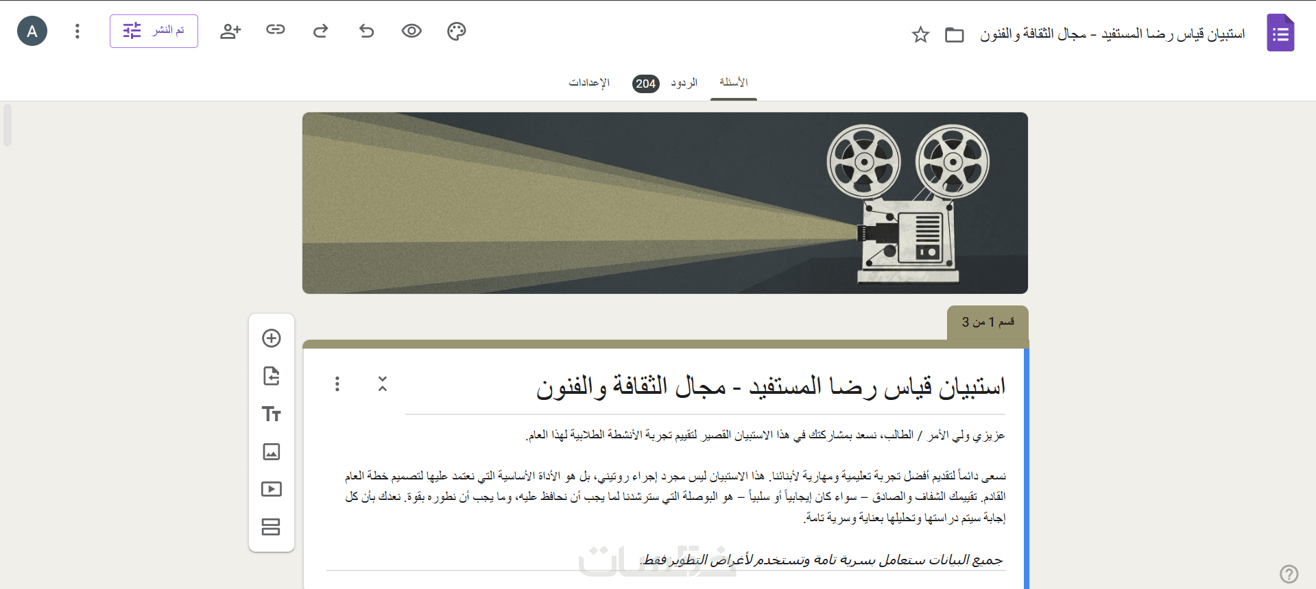 ملف Excel أو Google Sheets مربوط بالنموذج لتفريغ الردود فيه بشكل لحظي وتلقائي .