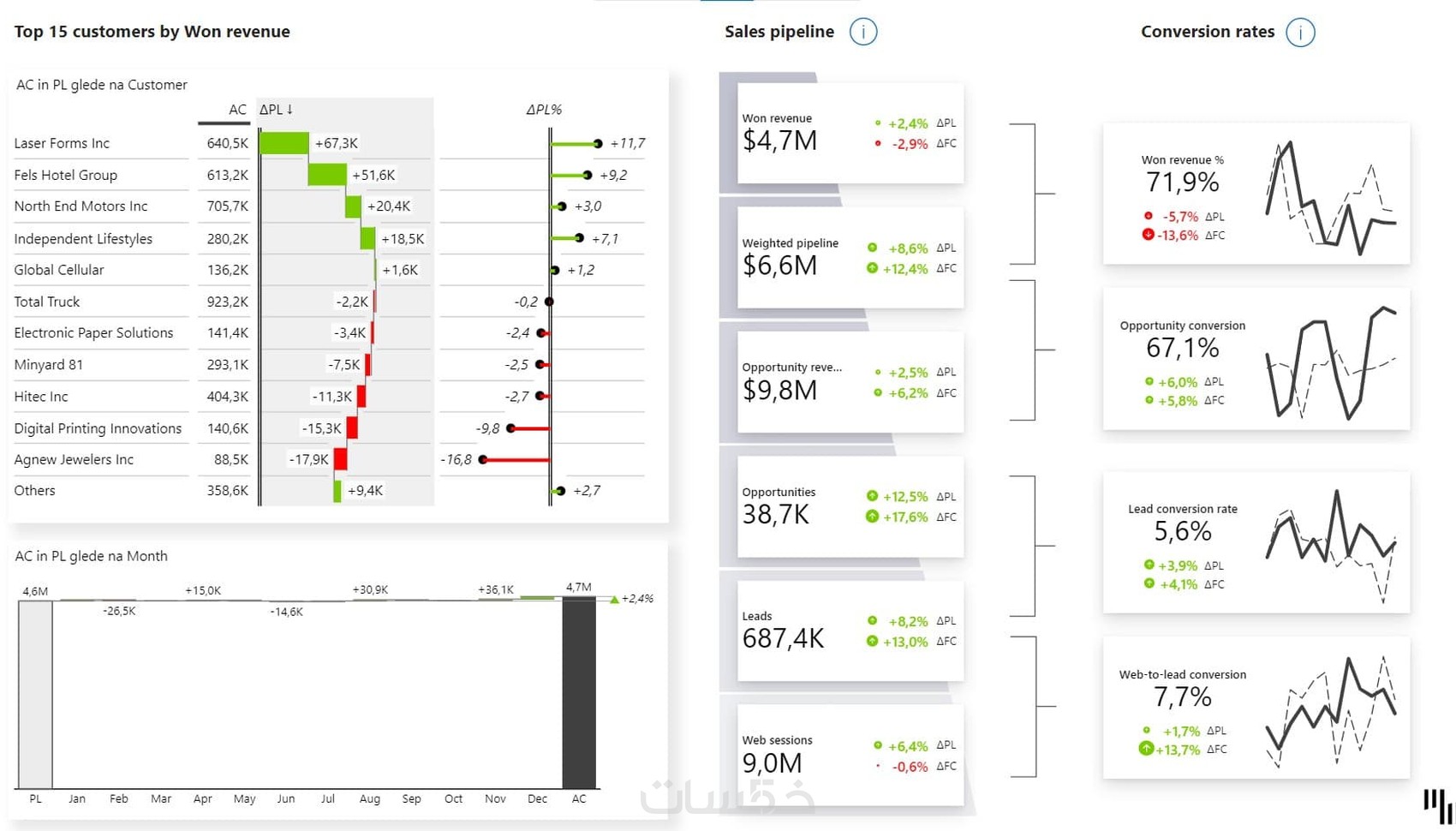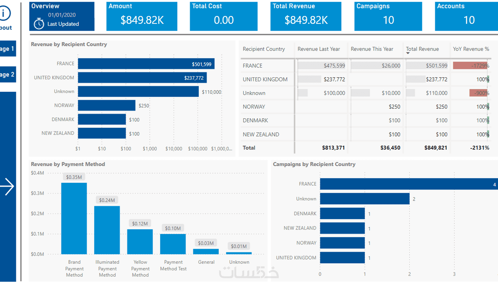 تقرير تفاعلي على برنامج power bi مكون من صفحة واحدة ويحتوي على 10 رسومات بيانية