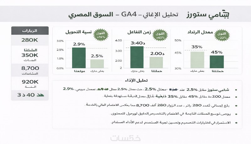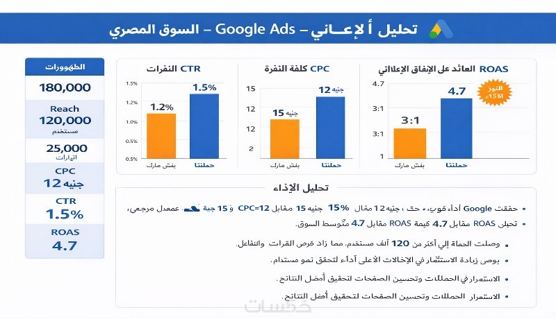 ستحصل على تقرير مبسّط يوضح أهم المؤشرات التسويقية، مع توصيات عملية قابلة للتنفيذ لتحسين النتائج وزيادة كفاءة الحملات.