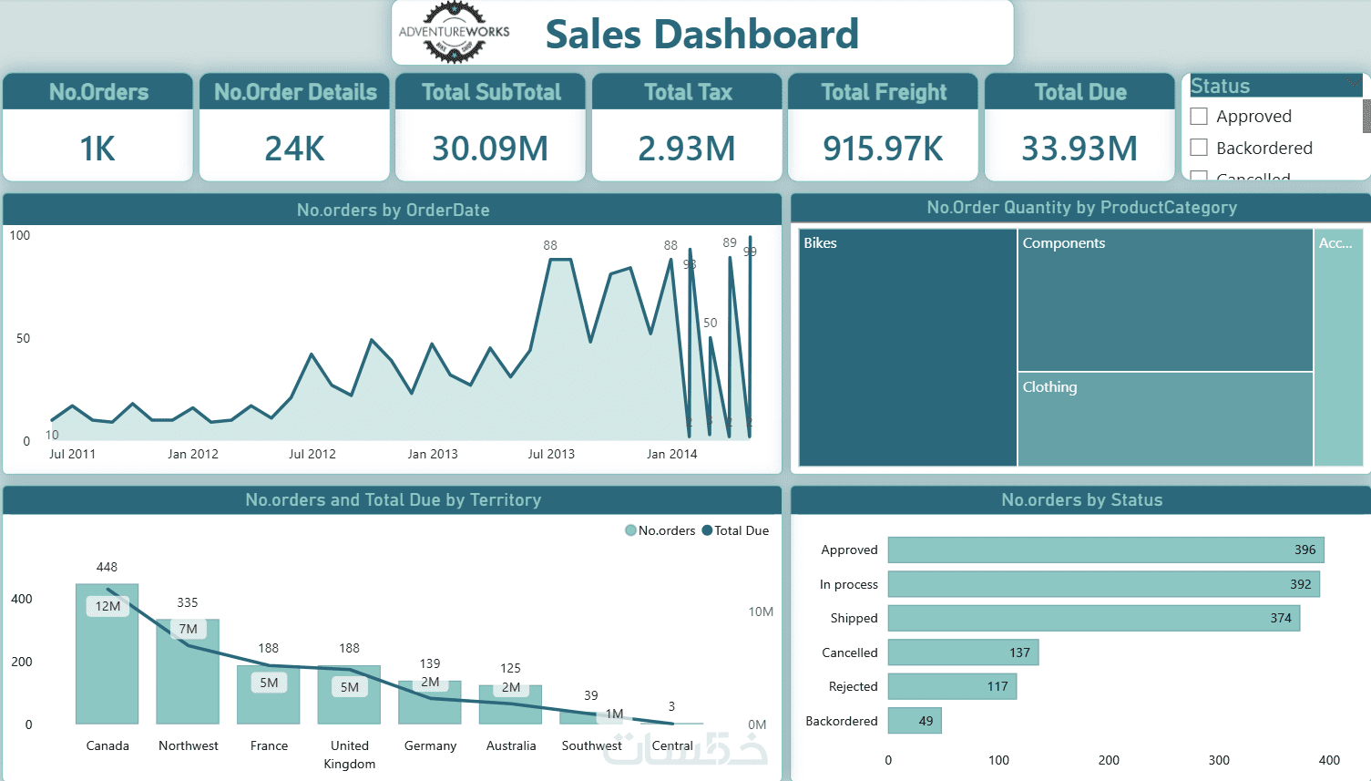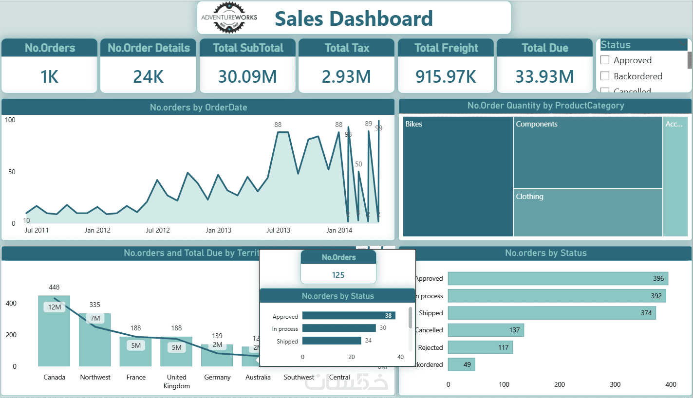 • مؤشرات أداء رئيسية: عدد الطلبات، تفاصيل الطلبات، إجمالي المبيعات، الضرائب والشحن، Total Due