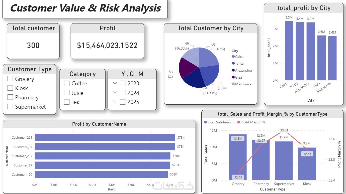 في هذا المشروع قمت بتحليل بيانات مبيعات كاملة وبناء نموذج بيانات احترافي باستخدام أسلوب Star Schema لربط جدول العمليات (Fact Sales) بجداول الأبعاد (Customer – Product – SalesRep – Date).