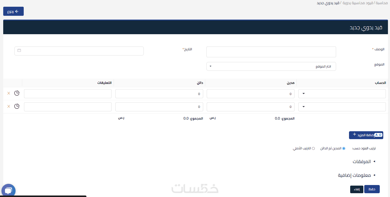 ادخال 100 قيد محاسبي اضافي لجميع الحركات ( مصورفات - مبيعات - مشتريات - رواتب - تسويات بنكية )