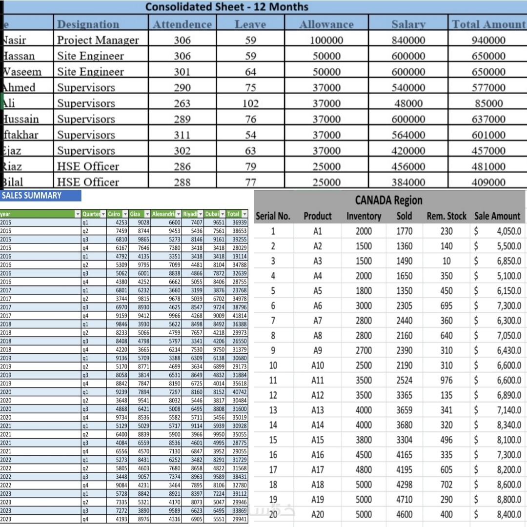 Excel / Google Sheets: إدخال بيانات، تنظيف وتنسيق (Data Cleaning & Formatting)، جداول ورسوم بيانية، صيغ متقدمة (VLOOKUP – IF – SUM)، Pivot Tables، تصميم Dashboards تفاعلية.