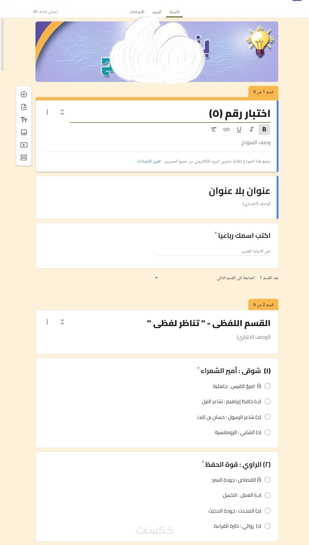 إعداد اختبار بأسئلة اختيار من متعدد، صح وخطأ، أو أسئلة قصيرة.