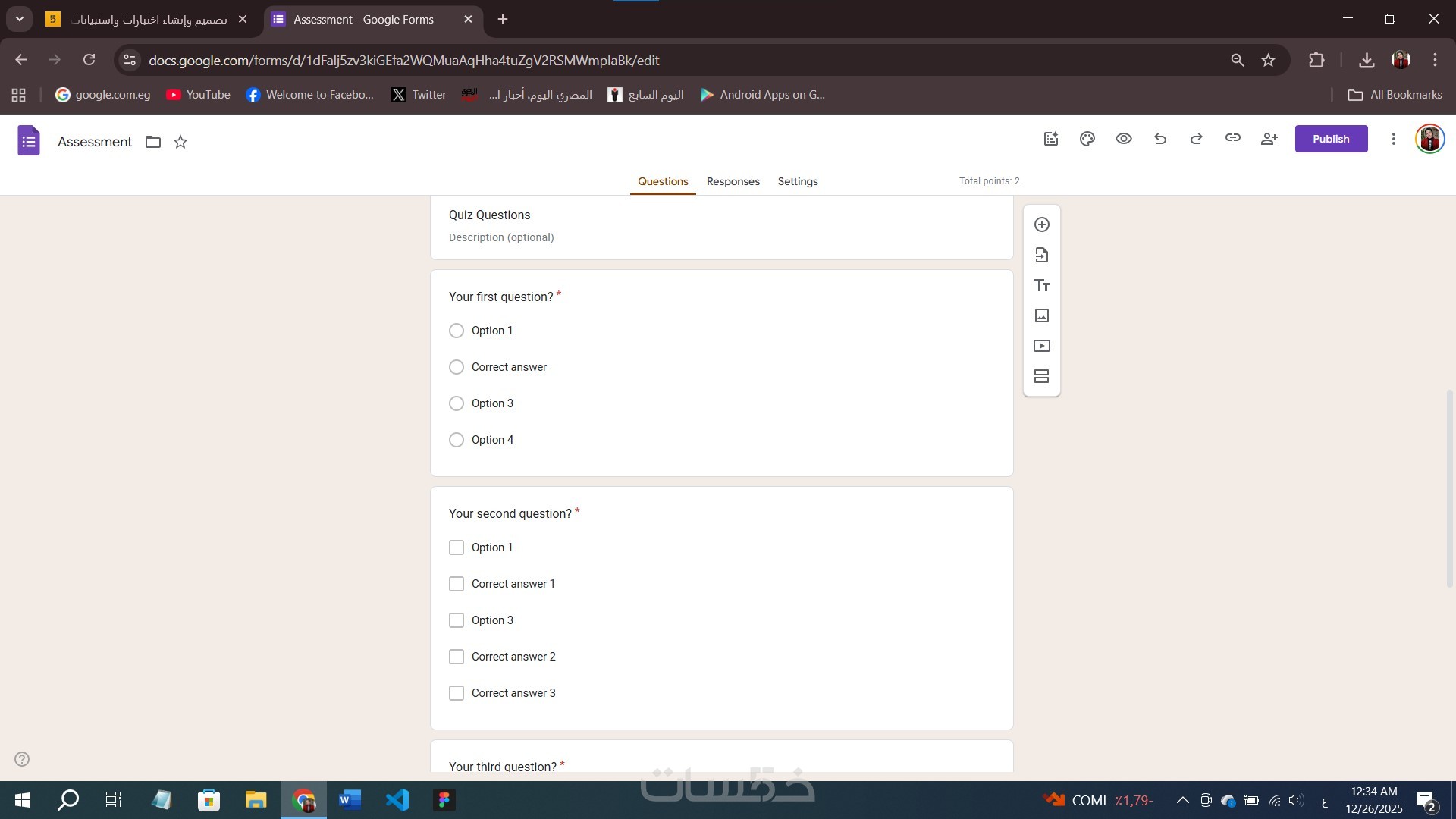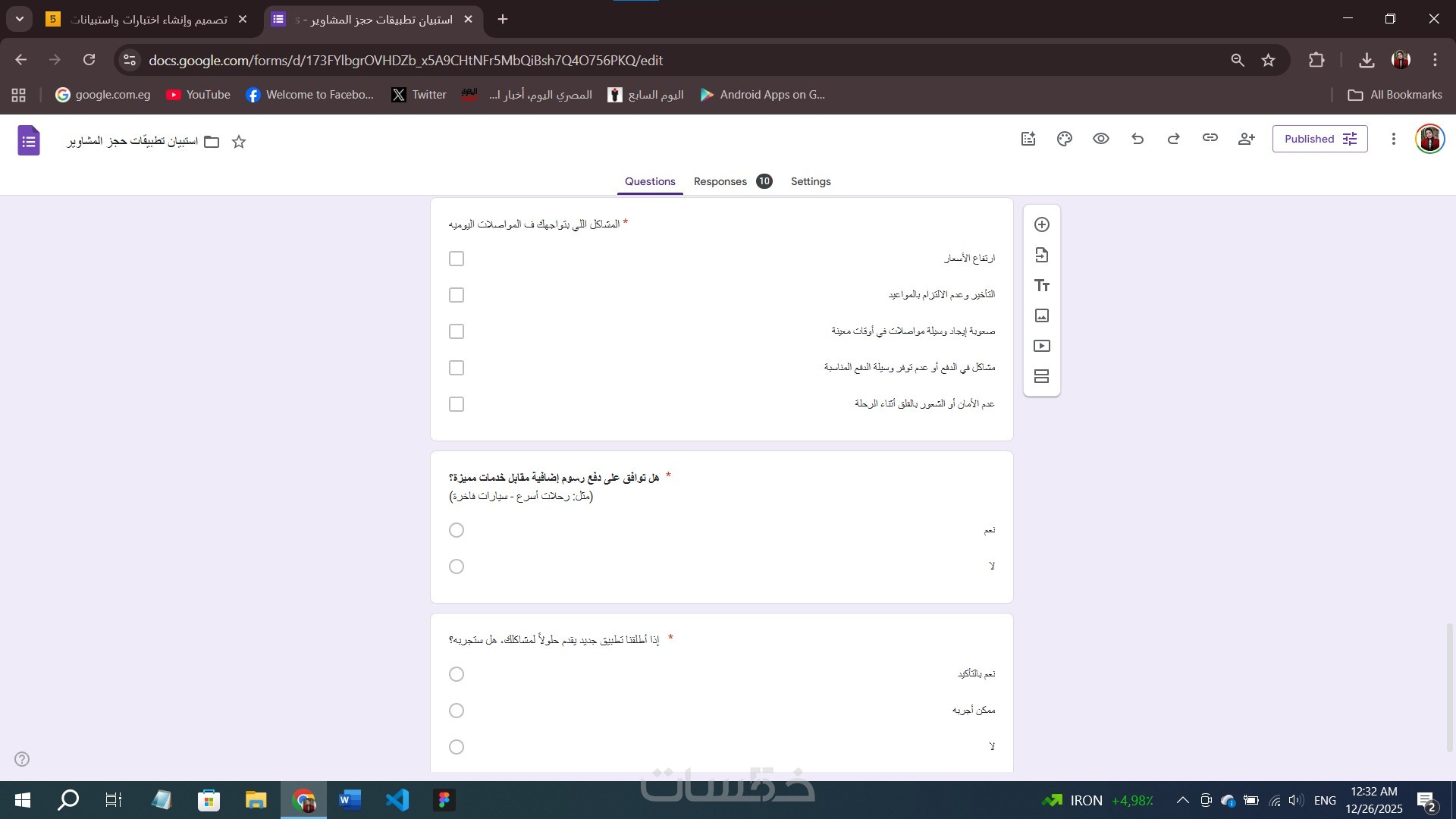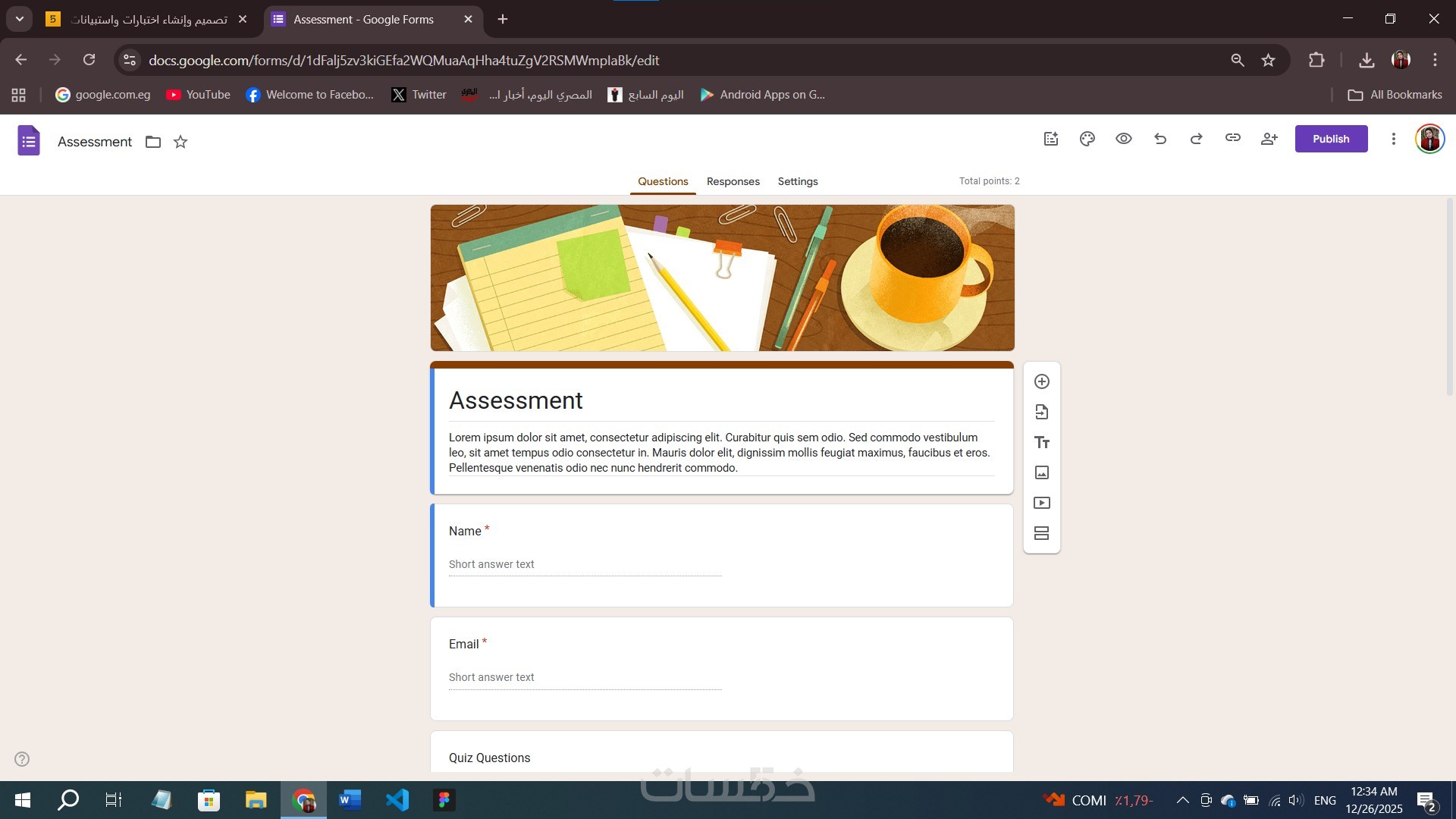 هل تبحث عن تصميم احترافي لاختبار إلكتروني أو استبيان بحثي؟ أقدم لك خدمة إنشاء نماذج Google Forms بدقة عالية وتنسيق جذاب يناسب هويتك.