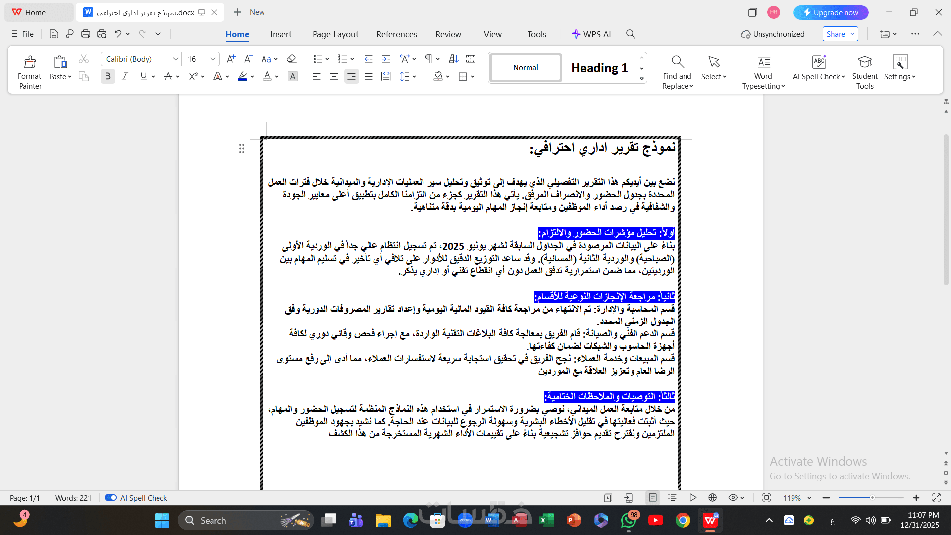 سأقوم بتسليمك تقرير إداري مصاغ بأسلوب رسمي، منسق بإطارات وعناوين واضحة، وجاهز للطباعة أو التقديم المباشر.