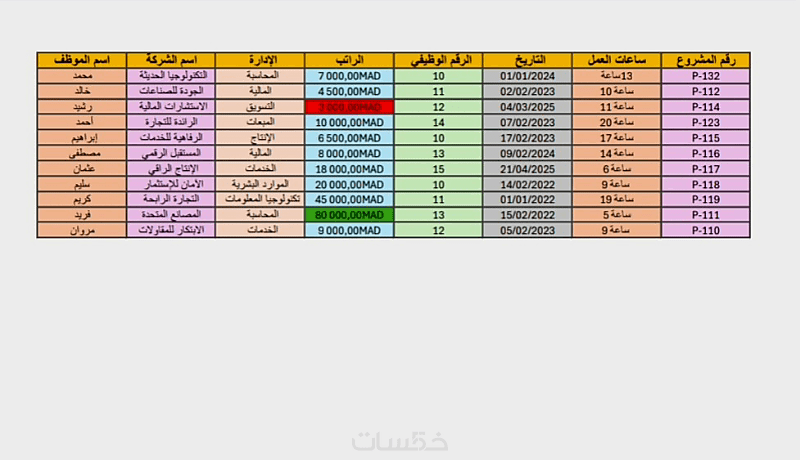 تنسيق الجداول (الألوان، الخطوط، والحدود) لتسهيل القراءة والتحليل.
