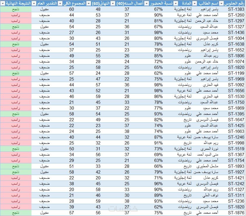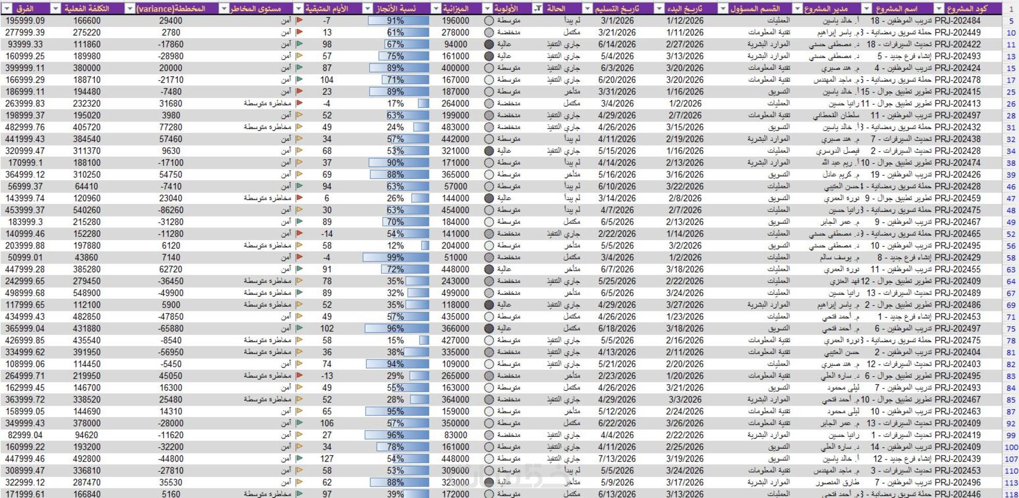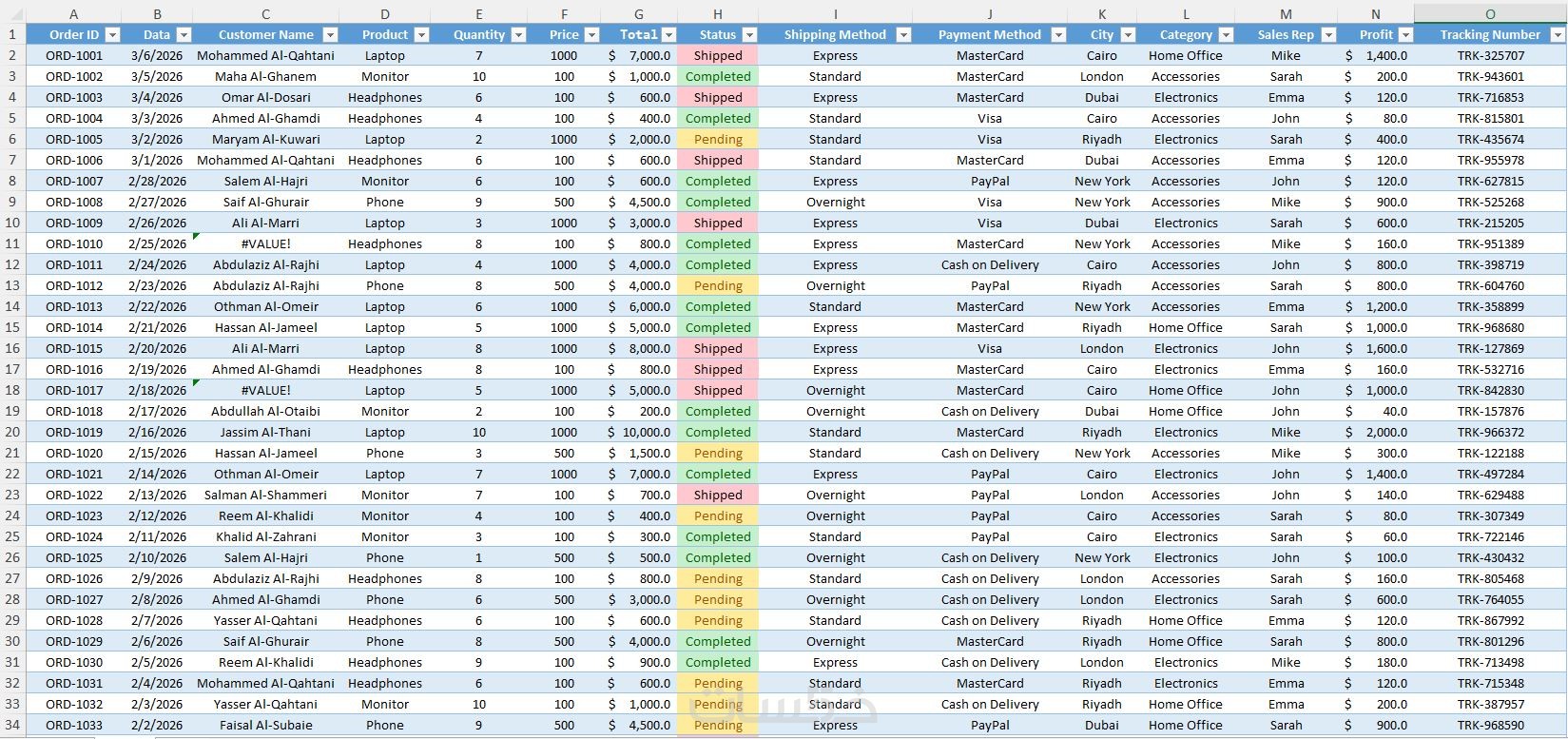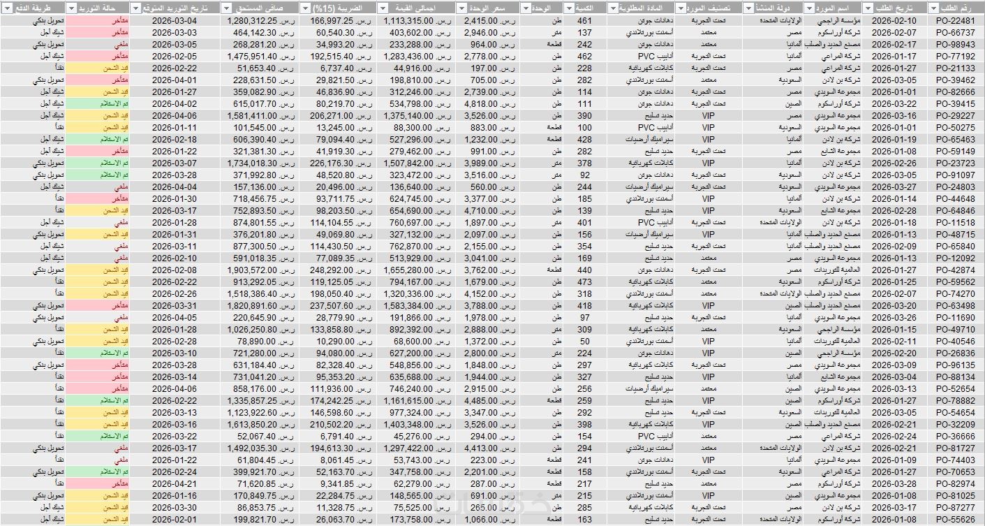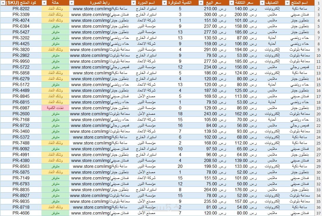 ملف Excel احترافي ومنظم يحتوي على البيانات المطلوبة.