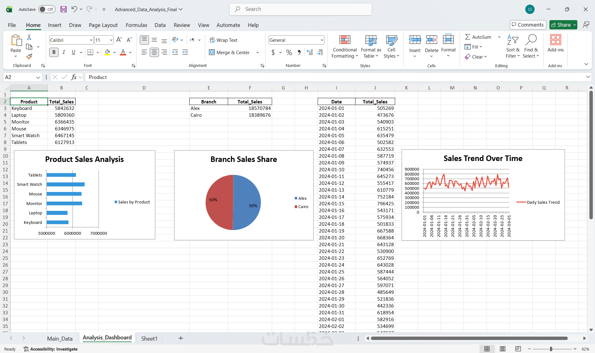 شيت خاص داخل نفس ملف الإكسيل يحتوي على رسوم بيانية تفاعلية (Charts) تلخص النتائج (مثل مبيعات المنتجات، حصة الفروع، وتطور المبيعات زمنياً).
