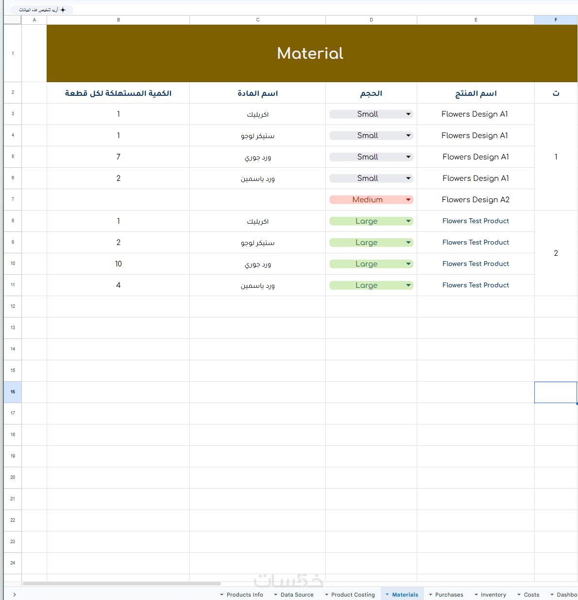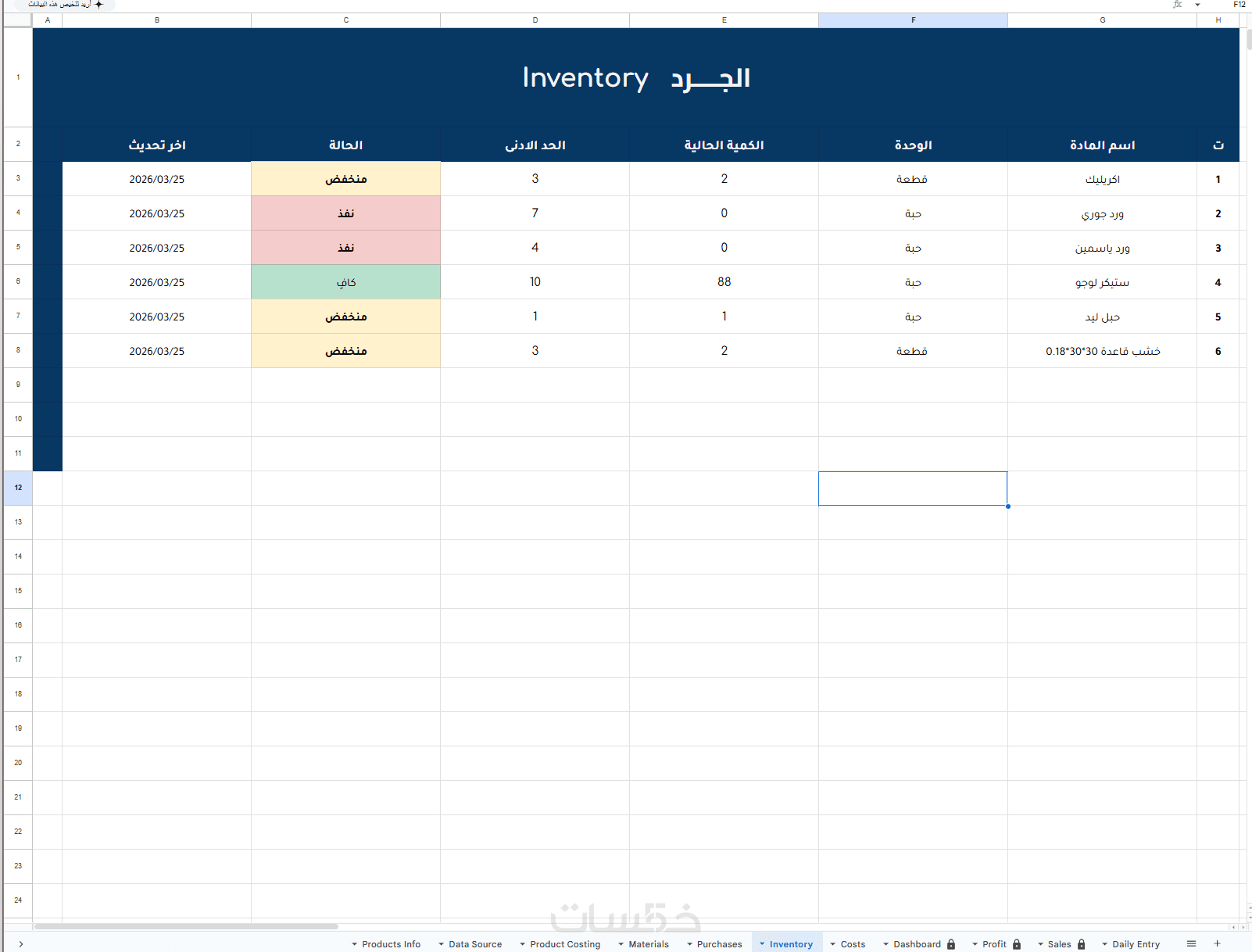عبارة عن 11 صفحة (Daily Entry/Sales/Profit/Costs/Products Info/Dashboard/Purchase/ Material/ Data Source/Inventory/Product costing)