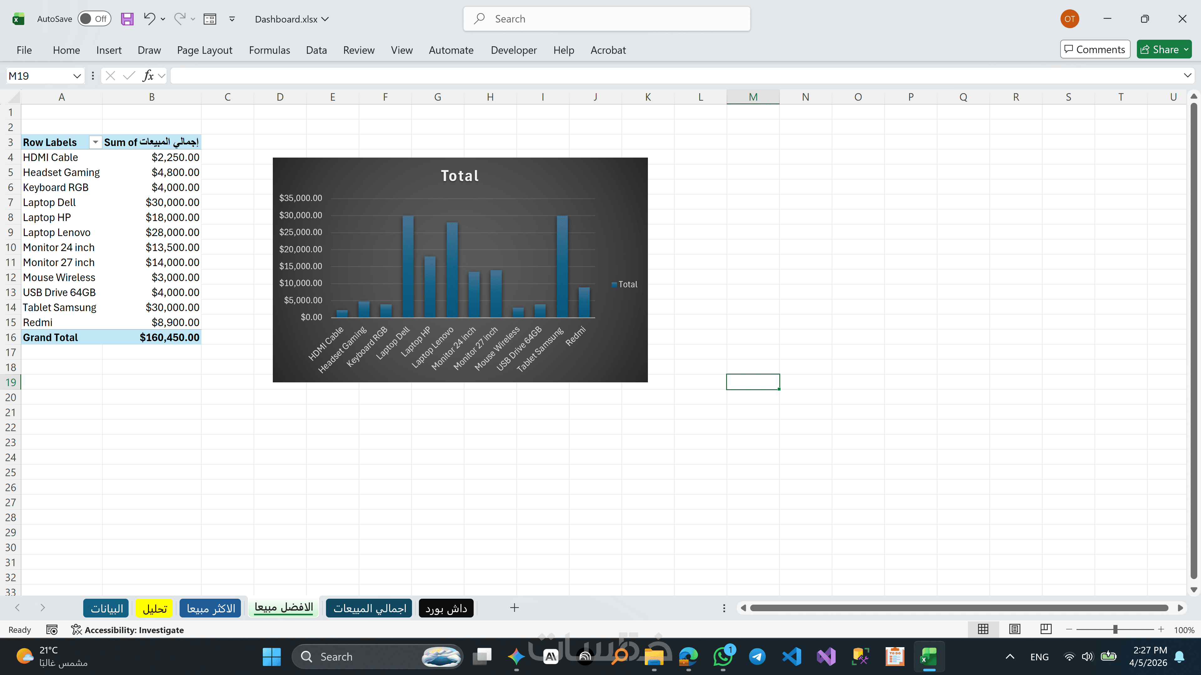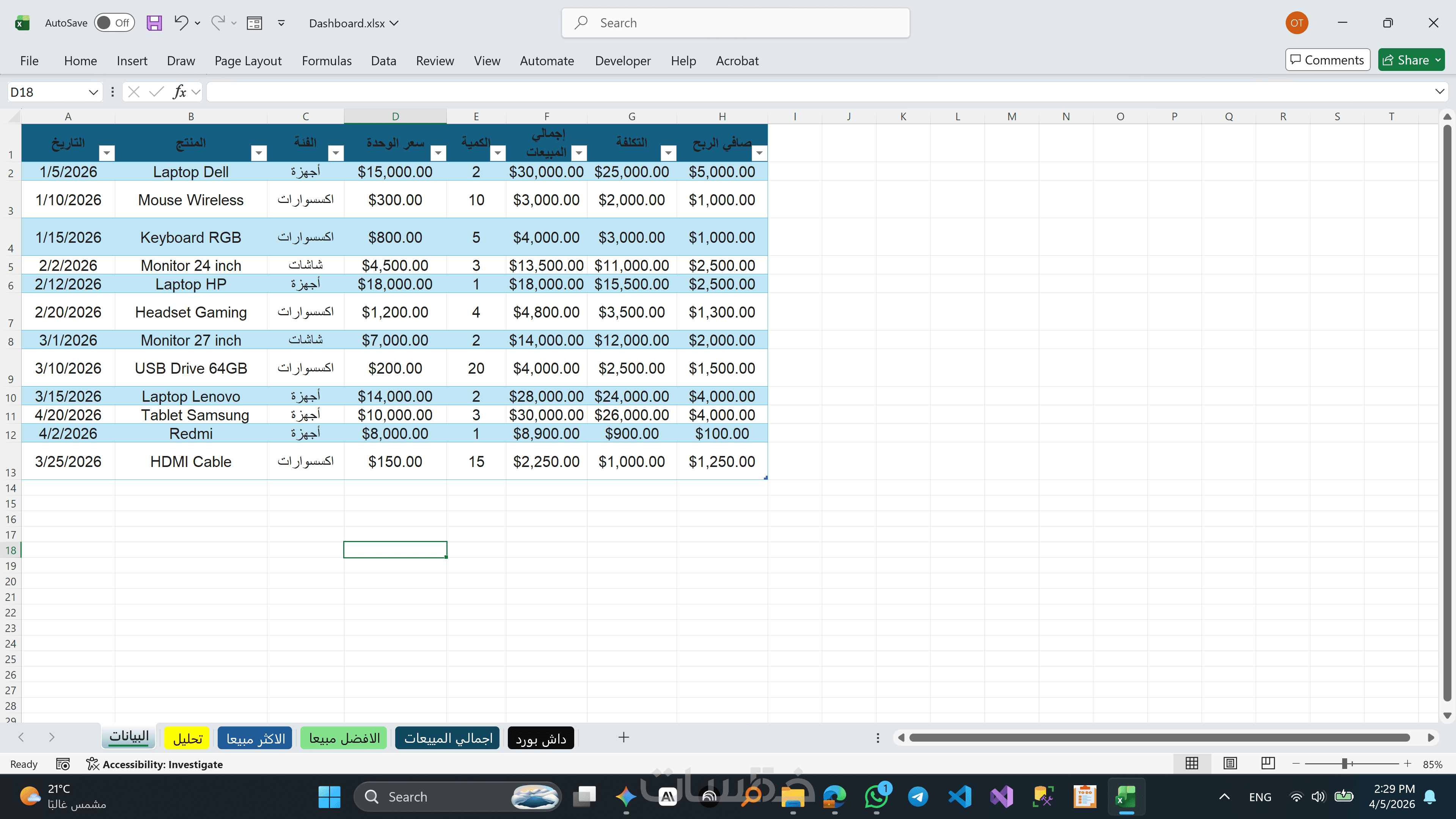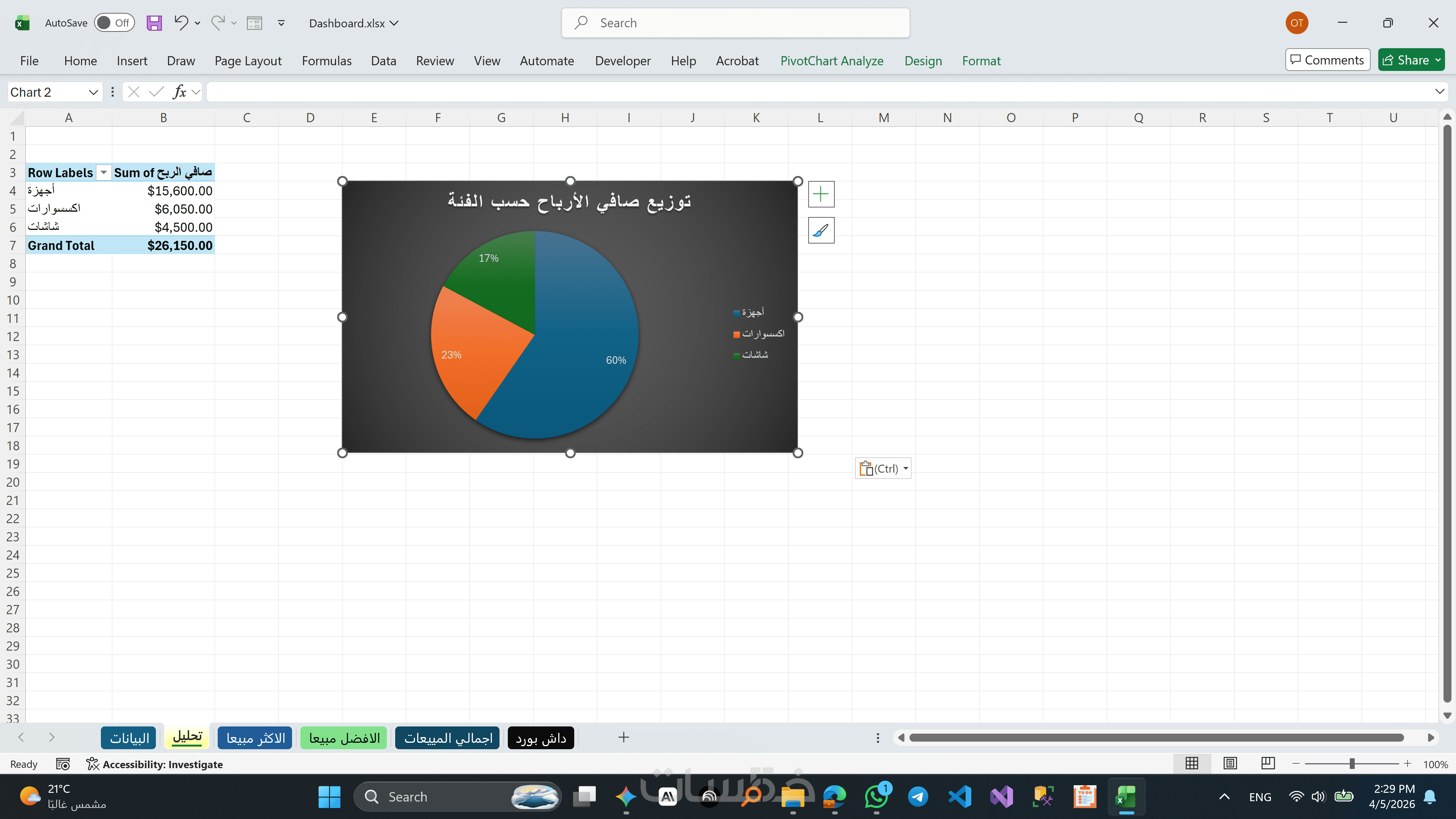 بناء تقارير ذكية تظهر الخلاصة (إجمالي الأرباح، نسب المبيعات، أفضل المنتجات) بشكل